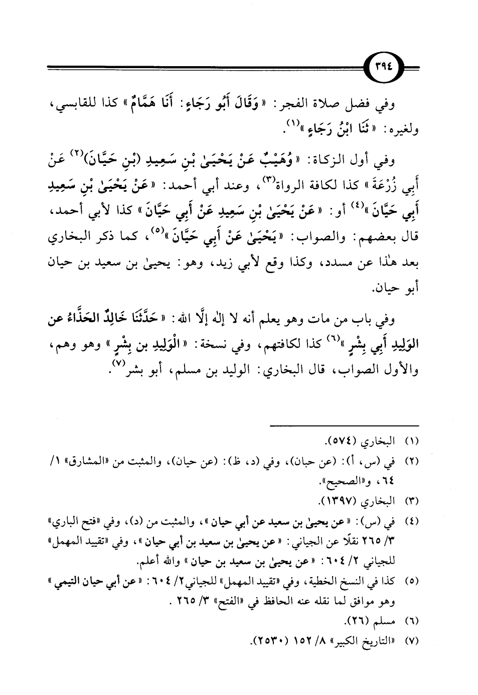 (¬4) في (س): "عن يحيى بن سعيد عن أبي حيان"، والمثبت من (د)، وفي "فتح الباري" 3/ 265 نقلاً عن الجياني: "عن يحيى بن سعيد بن أبي حيان"، وفي "تقييد المهمل" للجياني 2/ 604: "عن يحيى بن سعيد بن حيان" والله أعلم.