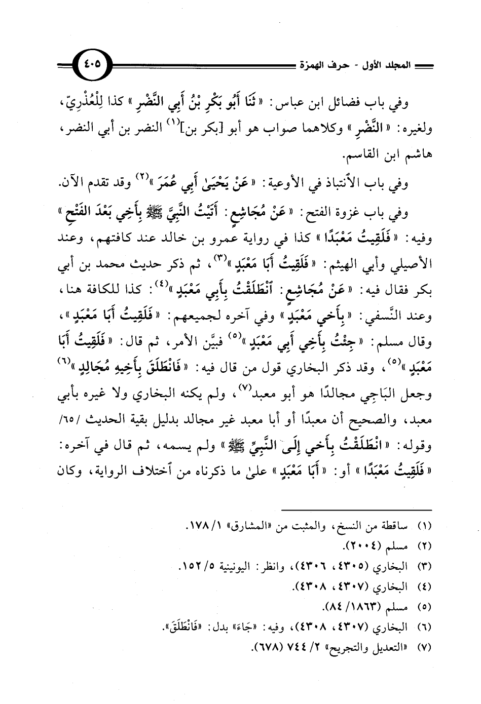 وفي باب غزوة الفتح: "عَنْ مُجَاشِعٍ: أَتَيْتُ النَّبِيَّ - صلى الله عليه وسلم - بِأَخِي بَعْدَ الفَتْحِ" وفيه: "فَلَقِيتُ مَعْبَدًا" كذا في رواية عمرو بن خالد عند كافتهم، وعند الأصيلي وأبي الهيثم: "فَلَقِيتُ أَبَا مَعْبَدٍ" (¬3)، ثم ذكر حديث محمَّد بن أبي بكر فقال فيه: "عَنْ مُجَاشِعٍ: انْطَلَقْتُ بِأَبِي مَعْبَدٍ" (¬4): كذا للكافة هنا، وعند النَّسفي: "بِأَخي مَعْبَدٍ" وفي آخره لجميعهم: "فَلَقِيتُ أَبَا مَعْبَدٍ"، وقال مسلم: "جِئْتُ بِأَخِي أَبِي مَعْبَدٍ" (¬5) فبيَّن الأمر، ثم قال: "فَلَقِيتُ أَبَا مَعْبَدٍ" (5)، وقد ذكر البخاري قول من قال فيه: "فَانْطَلَقَ بِأَخِيهِ مُجَالِدٍ" (¬6) وجعل البَاجِي مجالدًا هو أبو معبد (¬7)، ولم يكنه البخاري ولا غيره بأبي معبد، والصحيح أن معبدًا أو أبا معبد غير مجالد بدليل بقية الحديث وقوله: "انْطَلَقْتُ بِأَخي إِلَى النَّبِيَّ - صلى الله عليه وسلم -" ولم يسمه، ثم قال في آخره: "فَلَقِيتُ مَعْبَدًا" أو: "أَبَا مَعْبَدٍ" على ما ذكرناه من اختلاف الرواية، وكان