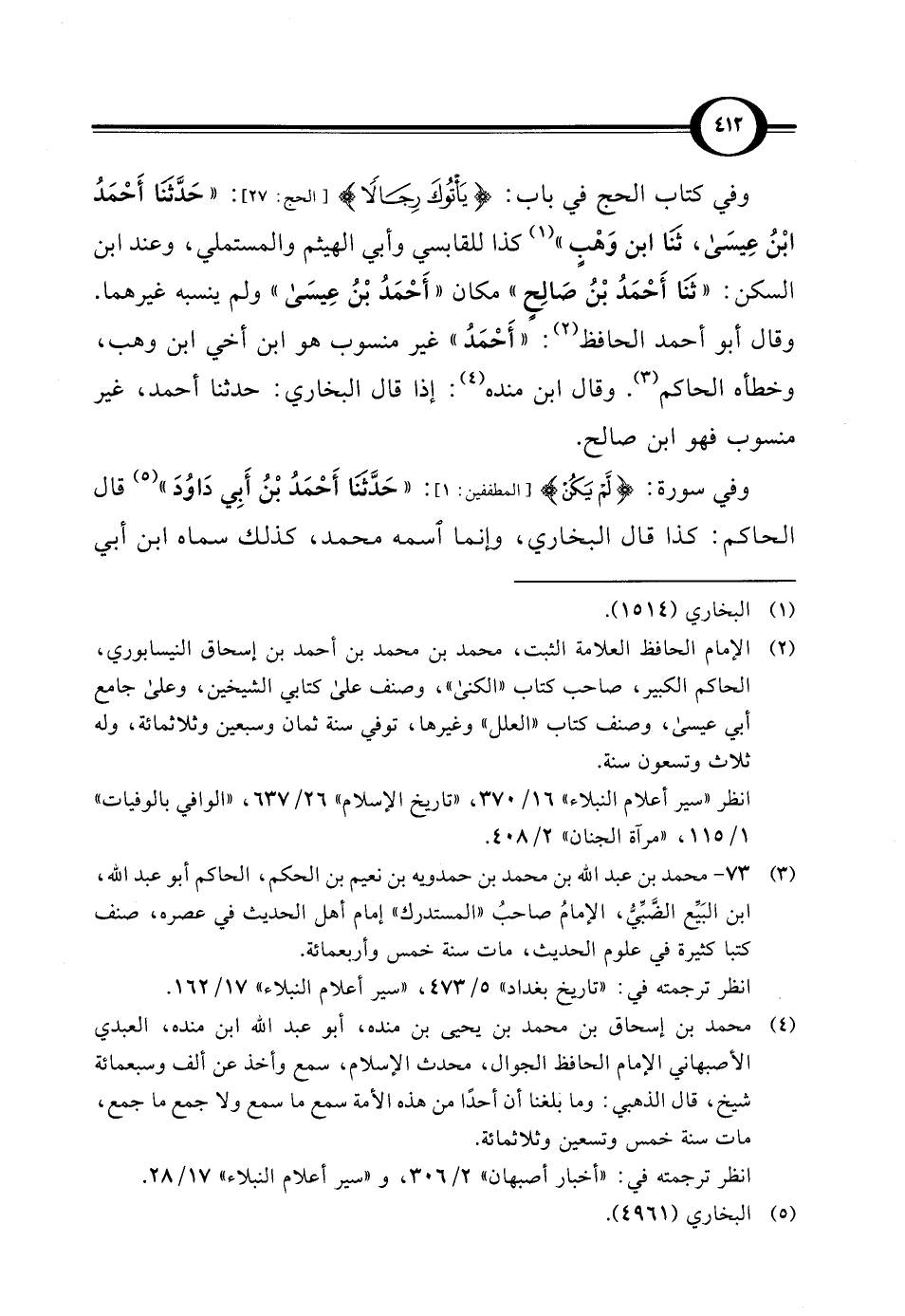 وفي كتاب الحج في باب: {يَأْتُوكَ رِجَالًا} [الحج: 27]: "حَدَّثنَا أَحْمَدُ ابْنُ عِيسَى، ثنَا ابن وَهْبٍ" (¬1) كذا للقابسي وأبي الهيثم والمستملي، وعند ابن السكن: "ثنَا أَحْمَدُ بْنُ صَالِحٍ" مكان "أَحْمَدُ بْنُ عِيسَى" ولم ينسبه غيرهما. وقال أبو أحمد الحافظ (¬2): "أَحْمَدُ" غير منسوب وابن أخي ابن وهب، وخطأه الحاكم (¬3). وقال ابن منده (¬4): إذا قال البخاري: حدثنا أحمد، غير منسوب فهو ابن صالح.