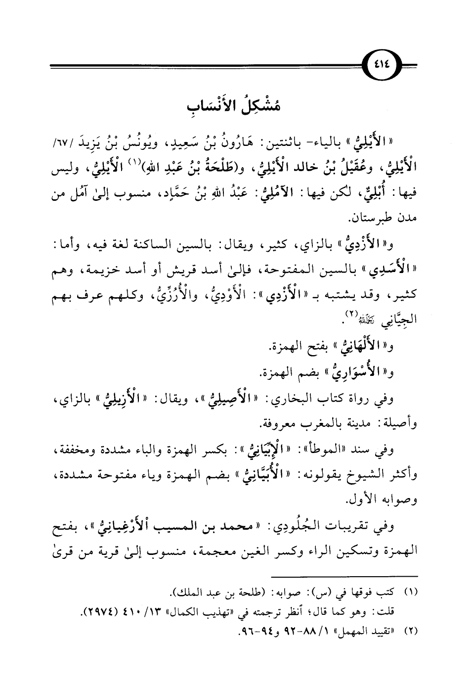 " الأيْلِيُّ" بالياء - باثنتين: هَارُونُ بْنُ سَعِيدٍ، ويُونُسُ بْنُ يَزِيدَ الأيْلِيُّ، وعُقَيْلُ بْنُ خالد الْأَيْلِيُّ، و (طَلْحَةُ بْنُ عَبْدِ اللهِ) (¬1) الأيْلِيُّ، وليس فيها: أُبْلِيٌّ، لكن فيها: الاَمُلِيُّ: عَبْدُ اللهِ بْنُ حَمَّاد، منسوب إلى آمُل من مدن طبرستان.