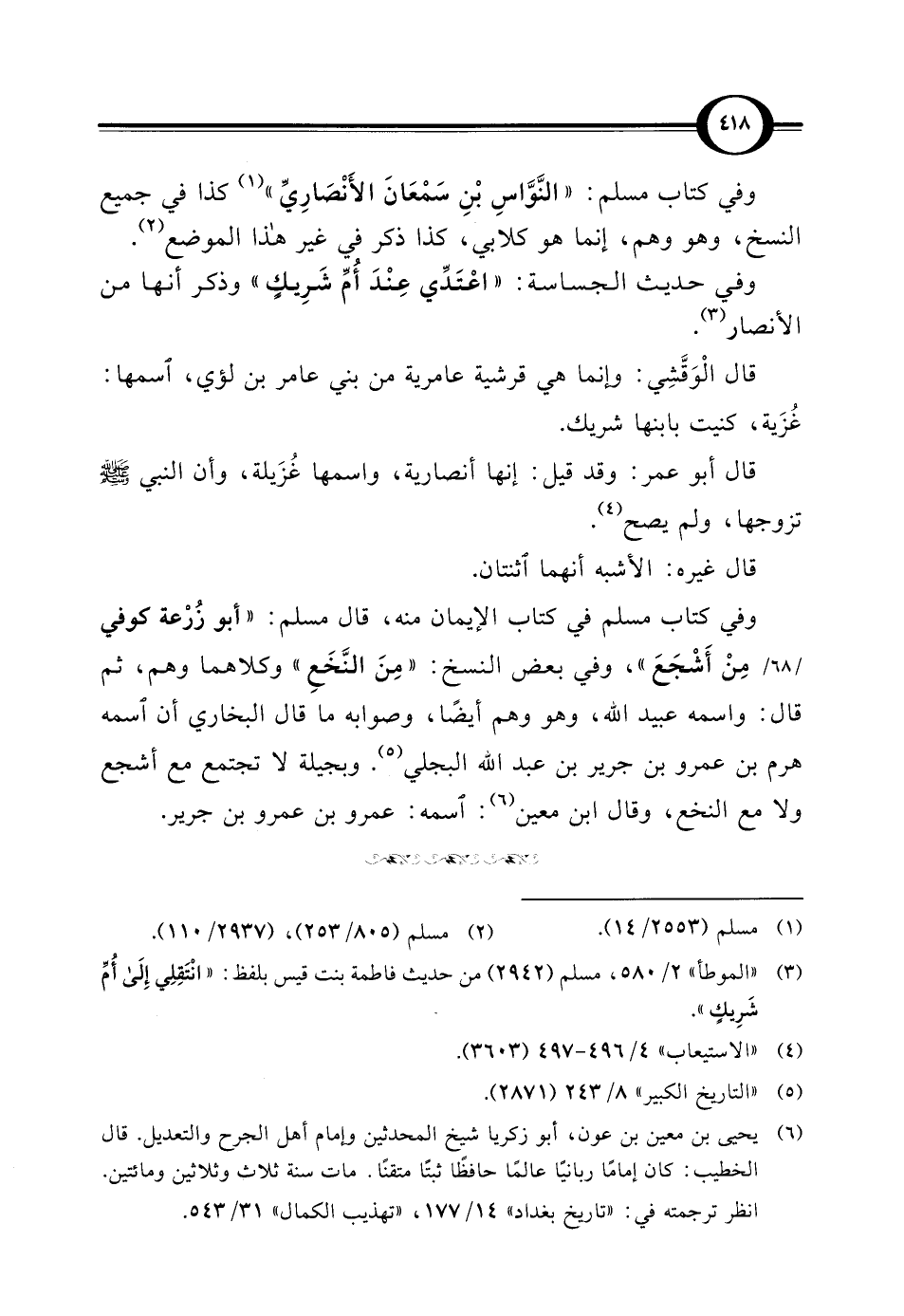 وفي كتاب مسلم في كتاب الإيمان منه، قال مسلم: "أبو زُرْعة كوفي مِنْ أَشْجَعَ"، وفي بعض النسخ: "مِنَ النَّخَعِ" وكلاهما وهم، ثم قال: واسمه عبيد الله، وهو وهم أيضًا، وصوابه ما قال البخاري أن اسمه هرم بن عمرو بن جرير بن عبد الله البجلي (¬5). وبجيلة لا تجتمع مع أشجع ولا مع النخع، وقال ابن معين (¬6): اسمه: عمرو بن عمرو بن جرير.