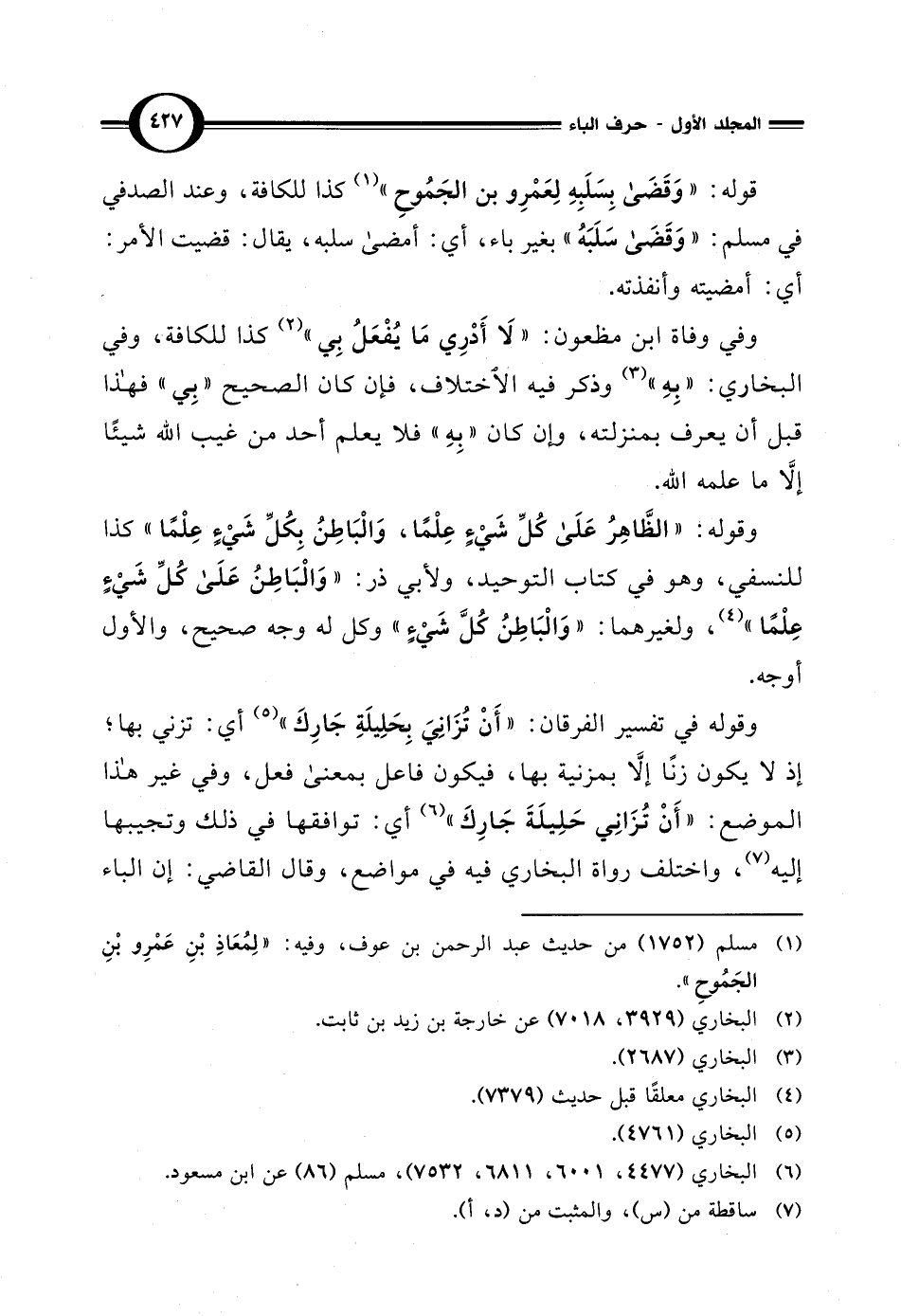 وقوله في تفسير الفرقان: "أَنْ تُزَانِيَ بِحَلِيلَةِ جَارِكَ " (¬5) أي: تزني بها؛ إذ لا يكون زنًا إلاَّ بمزنية بها، فيكون فاعل بمعنى فعل، وفي غير هذا الموضع: "أَنْ تُزَانِي حَلِيلَةَ جَارِكَ" (¬6) أي: توافقها في ذلك وتجيبها إليه (¬7)، واختلف رواة البخاري فيه في مواضع، وقال القاضي: إن الباء