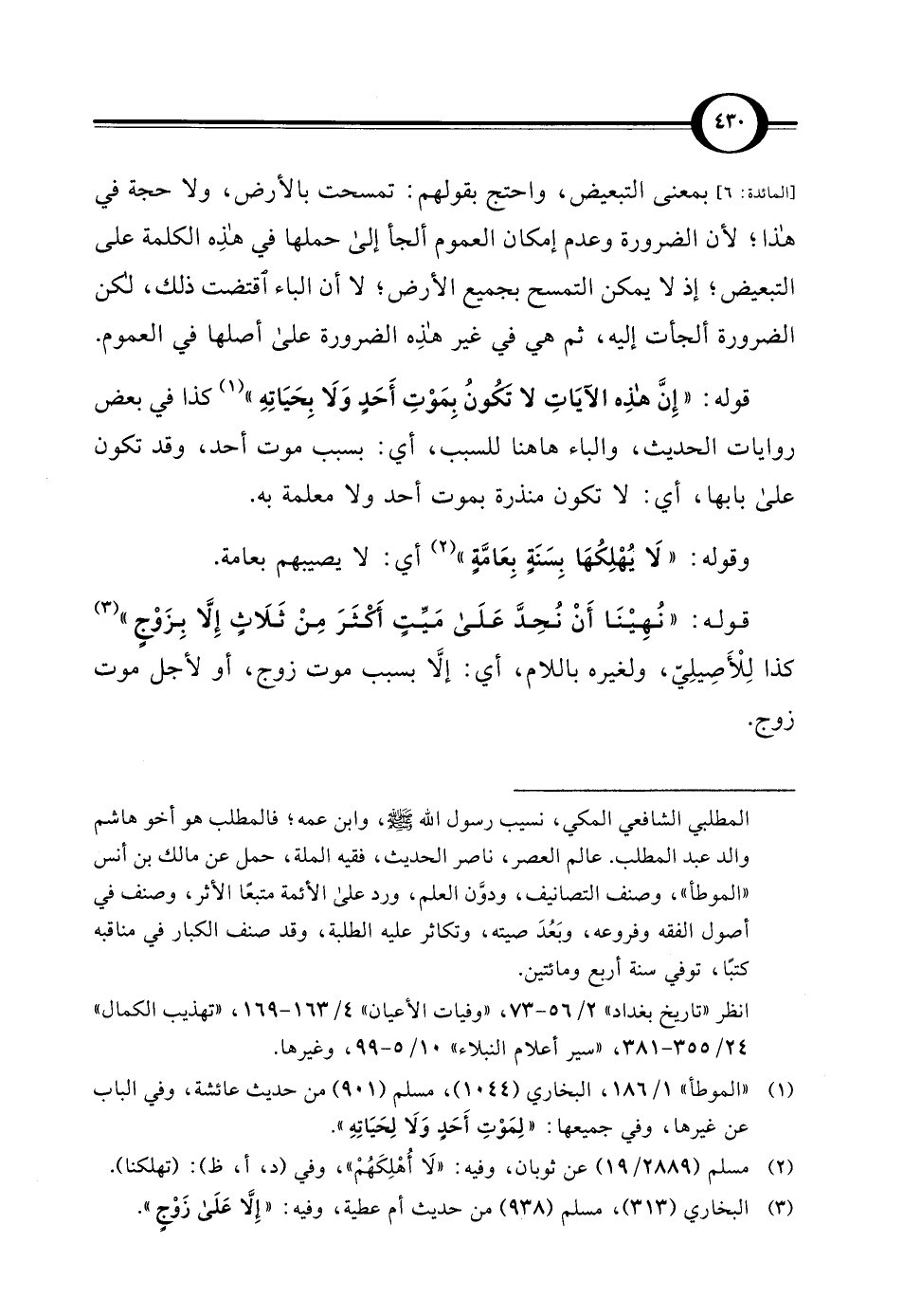 [المائدة: 6] بمعنى التبعيض، واحتج بقولهم: تمسحت بالأرض، ولا حجة في هذا؛ لأن الضرورة وعدم إمكان العموم ألجأ إلى حملها في هذِه الكلمة على التبعيض؛ إذ لا يمكن التمسح بجميع الأرض؛ لا أن الباء اقتضت ذلك، لكن الضرورة ألجأت إليه، ثم هي في غير هذِه الضرورة على أصلها في العموم.