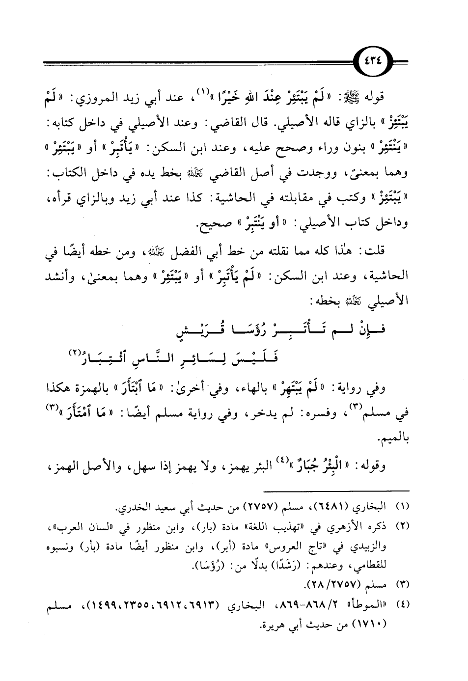 قلت: هذا كله مما نقلته من خط أبي الفضل - رحمه الله -، ومن خطه أيضًا في الحاشية، وعند ابن السكن: "لَمْ يَأْتَبِرْ" أو"يَبْتَئِرْ" وهما بمعنى، وأنشد الأصيلي - رحمه الله - بخطه: