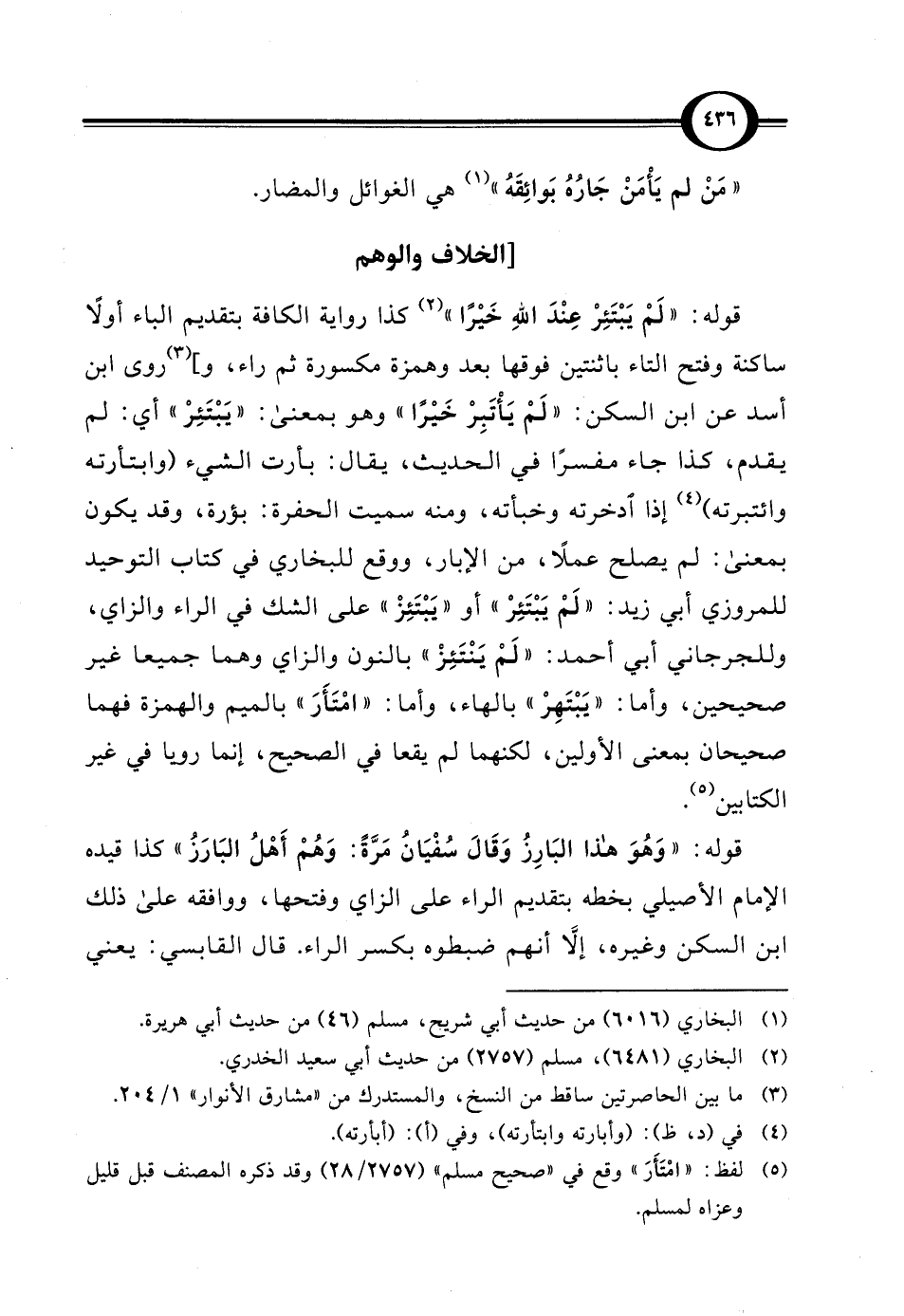 قوله: "لَمْ يَبْتَئِرْ عِنْدَ اللهِ خَيْرًا" (¬2) كذا رواية الكافة بتقديم الباء أولاً ساكنة وفتح التاء باثنتين فوقها بعد وهمزة مكسورة ثم راء، و] (¬3) روى ابن أسد عن ابن السكن: "لَمْ يَأْتَبِرْ خَيْرًا" وهو بمعنى: "يَبْتَئِرْ" أي: لم يقدم، كذا جاء مفسرًا في الحديث، يقال: بأرت الشيء (وابتأرته وائتبرته) (¬4) إذا ادخرته وخبأته، ومنه سميت الحفرة: بؤرة، وقد يكون بمعنى: لم يصلح عملاً، من الإبار، ووقع للبخاري في كتاب التوحيد للمروزي أبي زيد: "لَمْ يَبْتَئِرْ" أو "يَبْتَئِزْ" على الشك في الراء والزاي، وللجرجاني أبي أحمد: "لَمْ يَنْتَئِزْ" بالنون والزاي وهما جميعاً غير صحيحين، وأما: " يَبْتَهِرْ" بالهاء، وأما: "امْتَأَرَ" بالميم والهمزة فهما صحيحان بمعنى الأولين، لكنهما لم يقعا في الصحيح، إنما رويا في غير الكتابين (¬5).