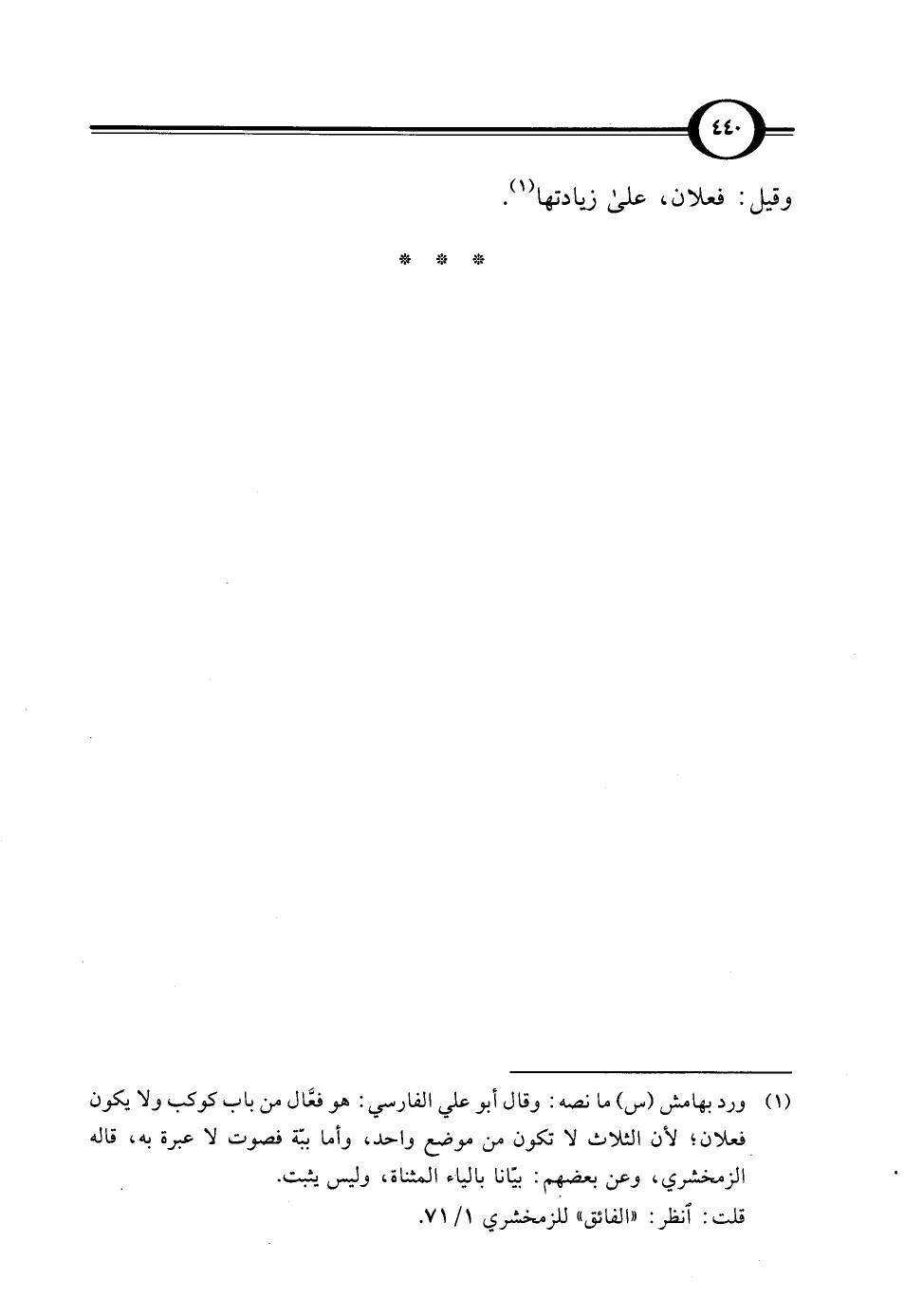 (¬1) ورد بهامش (س) ما نصه: وقال أبو علي الفارسي: هو فعَّال من باب كوكب ولا يكون فعلان؛ لأن الثلاث لا تكون من موضع واحد، وأما ببّة فصوت لا عبرة به، قاله الزمخشري، وعن بعضهم: بيّانا بالياء المثناة، وليس يثبت. قلت: انظر: "الفائق" للزمخشري 1/ 71.