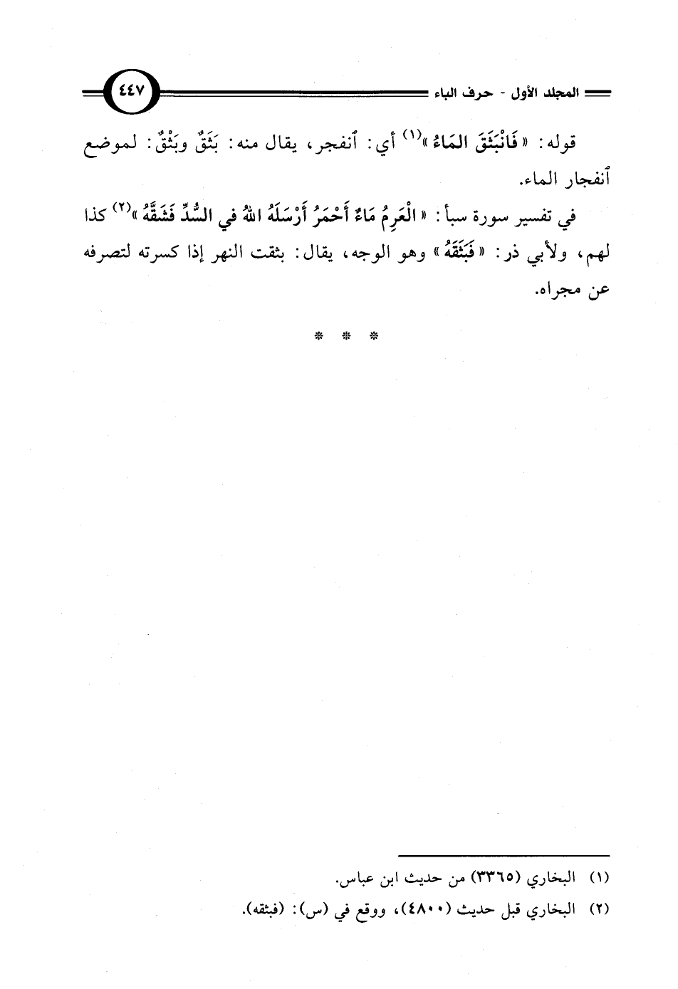 في تفسير سورة سبأ: "الْعَرِمُ مَاءٌ أَحْمَرُ أَرْسَلَهُ اللهُ في السُّدَّ فَشَقَّهُ" (¬2) كذا لهم، ولأبي ذر: "فَبَثَقَهُ" وهو الوجه، يقال: بثقت النهر إذا كسرته لتصرفه عن مجراه.