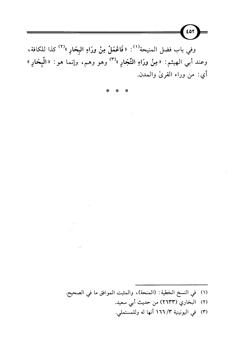 وفي باب فضل المنيحة (¬1): "فَاعْمَلْ مِنْ ورَاءِ البِحَارِ" (¬2) كذا للكافة، وعند أبي الهيثم: "مِنْ ورَاءِ التِّجَارِ" (¬3) وهو وهم، وإنما هو: "الْبِحَارِ" أي: من وراء القرى والمدن.