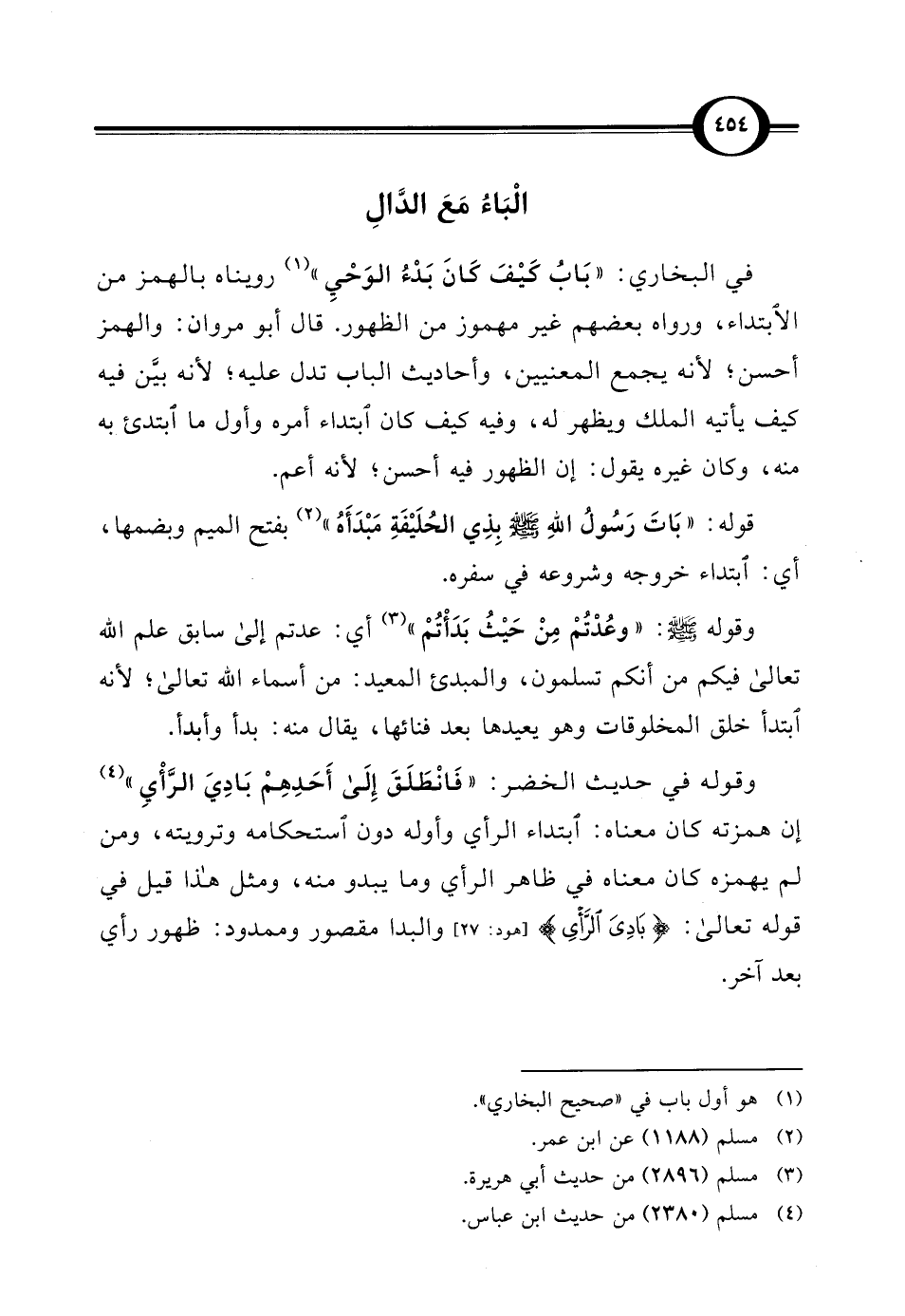 وقوله في حديث الخضر: " فَانْطَلَقَ إِلَى أَحَدِهِمْ بَادِيَ الرَّأْيِ" (¬4) إن همزته كان معناه: ابتداء الرأي وأوله دون استحكامه وترويته، ومن لم يهمزه كان معناه في ظاهر الرأي وما يبدو منه، ومثل هذا قيل في قوله تعالى: {بَادِيَ الرَّأْيِ} [هود: 27] والبدا مقصور وممدود: ظهور رأي بعد آخر.