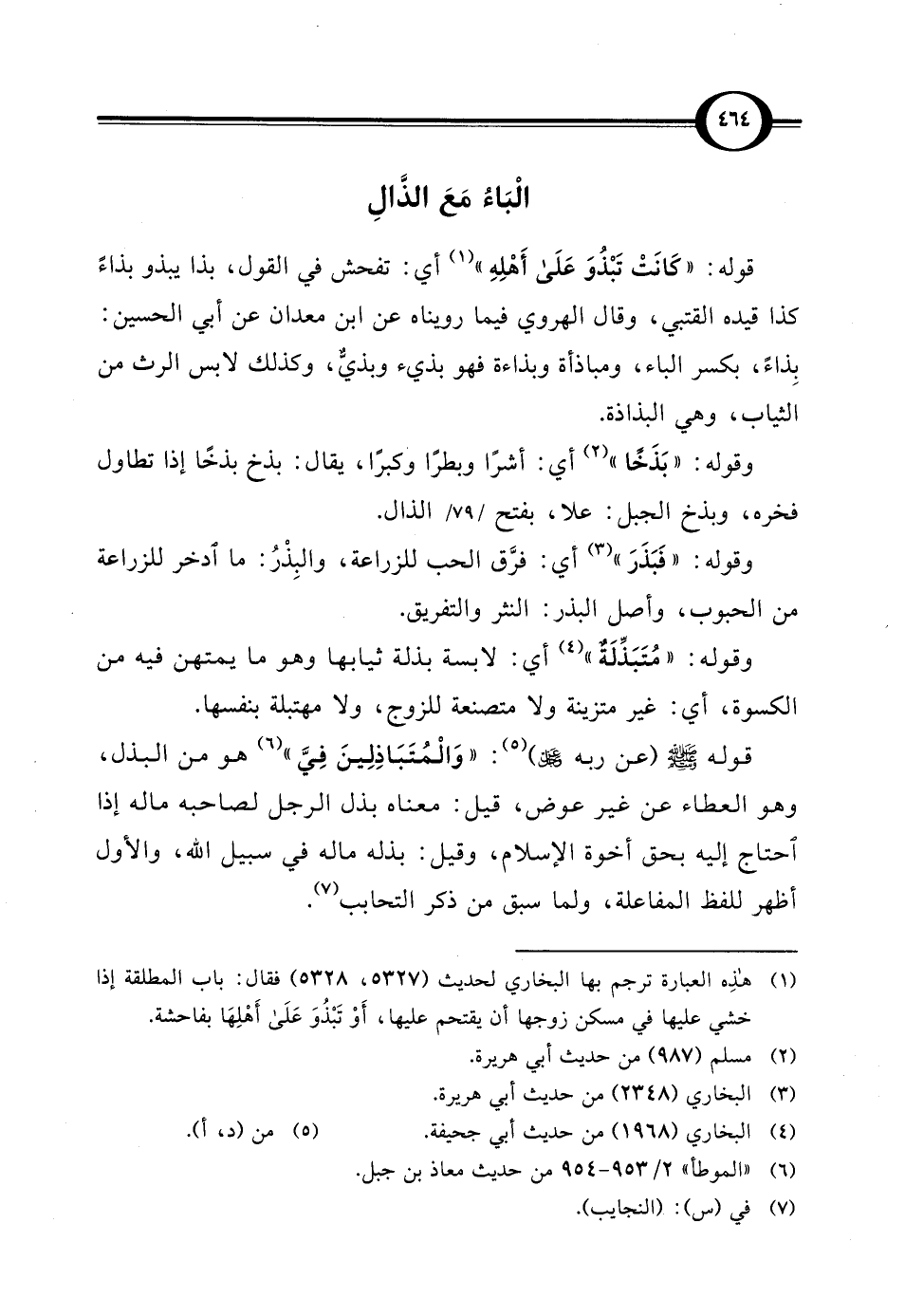 قوله: "كَانَتْ تَبْذُوَ عَلَى أَهْلِهِ" (¬1) أي: تفحش في القول، بذا يبذو بذاءً كذا قيده القتبي، وقال الهروي فيما رويناه عن ابن معدان عن أبي الحسين: بِذاءً، بكسر الباء، ومباذأة وبذاءة فهو بذيء وبذيٌّ، وكذلك لابس الرث من الثياب، وهي البذاذة.