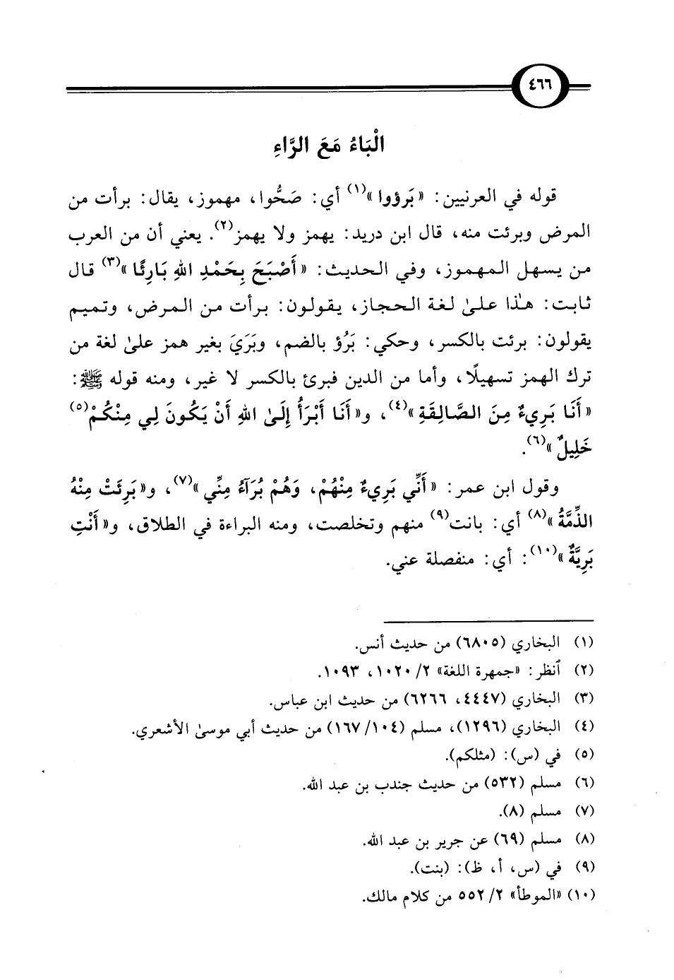 قوله في العرنيين: "بَرؤوا" (¬1) أي: صَحُّوا، مهموز، يقال: برأت من المرض وبرئت منه، قال ابن دريد: يهمز ولا يهمز (¬2). يعني أن من العرب من يسهل المهموز، وفي الحديث: "أَصْبَحَ بِحَمْدِ اللهِ بَارِئًا" (¬3) قال ثابت: هذا على لغة الحجاز، يقولون: برأت من المرض، وتميم يقولون: برئت بالكسر، وحكي: بَرُؤ بالضم، وبَرَيَ بغير همز على لغة من ترك الهمز تسهيلًا، وأما من الدين فبرئ بالكسر لا غير، ومنه قوله - صلى الله عليه وسلم -: "أَنَا بَرِيءٌ مِنَ الصَّالِقَةِ" (¬4)، و"أَنَا أَبْرَأُ إلى اللهِ أَنْ يَكُونَ لِي مِنْكُمْ (¬5) خَلِيلٌ" (¬6).