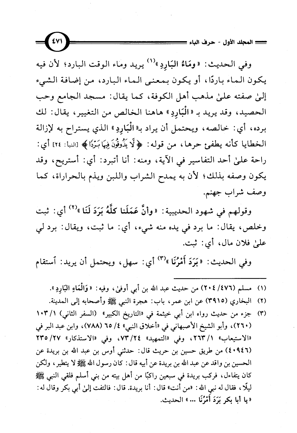 وفي الحديث: "ومَاءُ البَارِدِ" (¬1) يريد وماء الوقت البارد؛ لأن فيه يكون الماء باردًا، أو يكون بمعنى الماء البارد، من إضافة الشيء إلى صفته على مذهب أهل الكوفة، كما يقال: مسجد الجامع وحب الحصيد، وقد يريد بـ "الْبَارِدِ" هاهنا الخالص من التغيير، يقال: لك برده، أي: خالصه، ويحتمل أن يراد بـ "الْبَارِدِ" الذي يستراح به لإزالة الخطايا كأنه يطفئ حرها، من قوله: {لَا يَذُوقُونَ فِيهَا بَرْدًا} [النبأ: 24] أي: راحة على أحد التفاسير في الآية، ومنه: أنا أتبرد: أي: أستريح، وقد يكون وصفه بذلك؛ لأن به يمدح الشراب واللبن ويذم بالحراراة، كما وصف شراب جهنم.