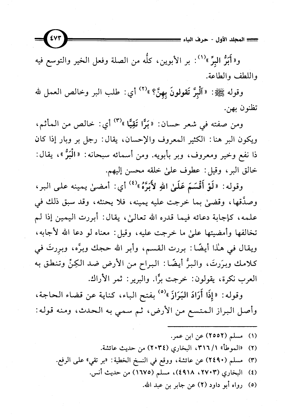 ومن صفته في شعر حسان: "بَرًّا تَقِيًّا" (¬3) أي: خالص من المأثم، ويكون البر هنا: الكثير المعروف والإحسان، يقال: رجل بر وبار إذا كان ذا نفع وخير ومعروف، وبر بأبويه. ومن أسمائه سبحانه: "الْبَرُّ"، يقال: خالق البر، وقيل: عطوف على خلقه محسن إليهم.