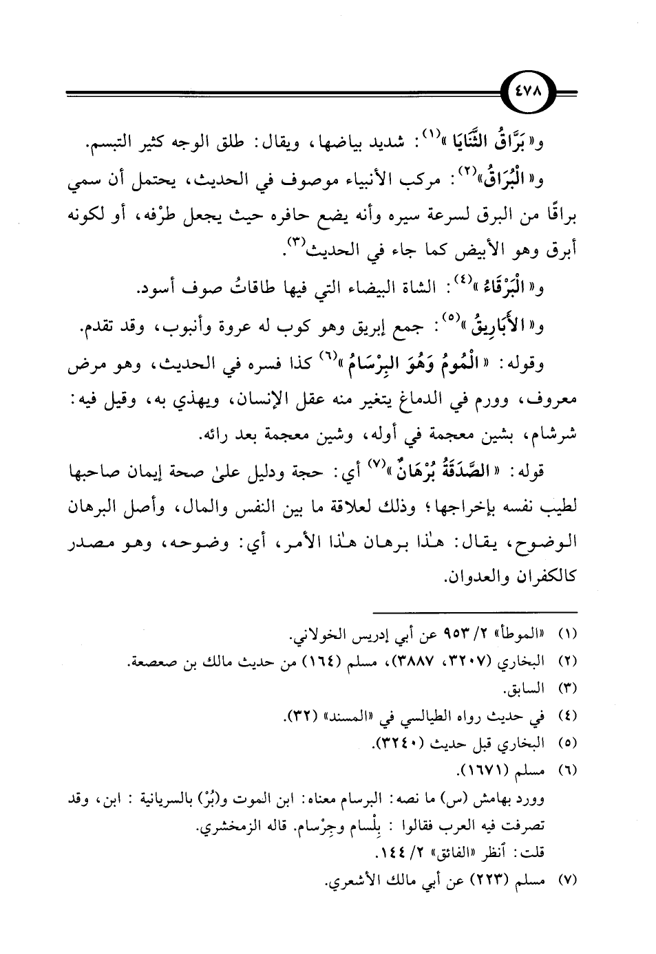 و"الْبُرَاقُ" (¬2): مركب الأنبياء موصوف في الحديث، يحتمل أن سمي براقًا من البرق لسرعة سيره وأنه يضع حافره حيث يجعل طرْفه، أو لكونه أبرق وهو الأبيض كما جاء في الحديث (¬3).