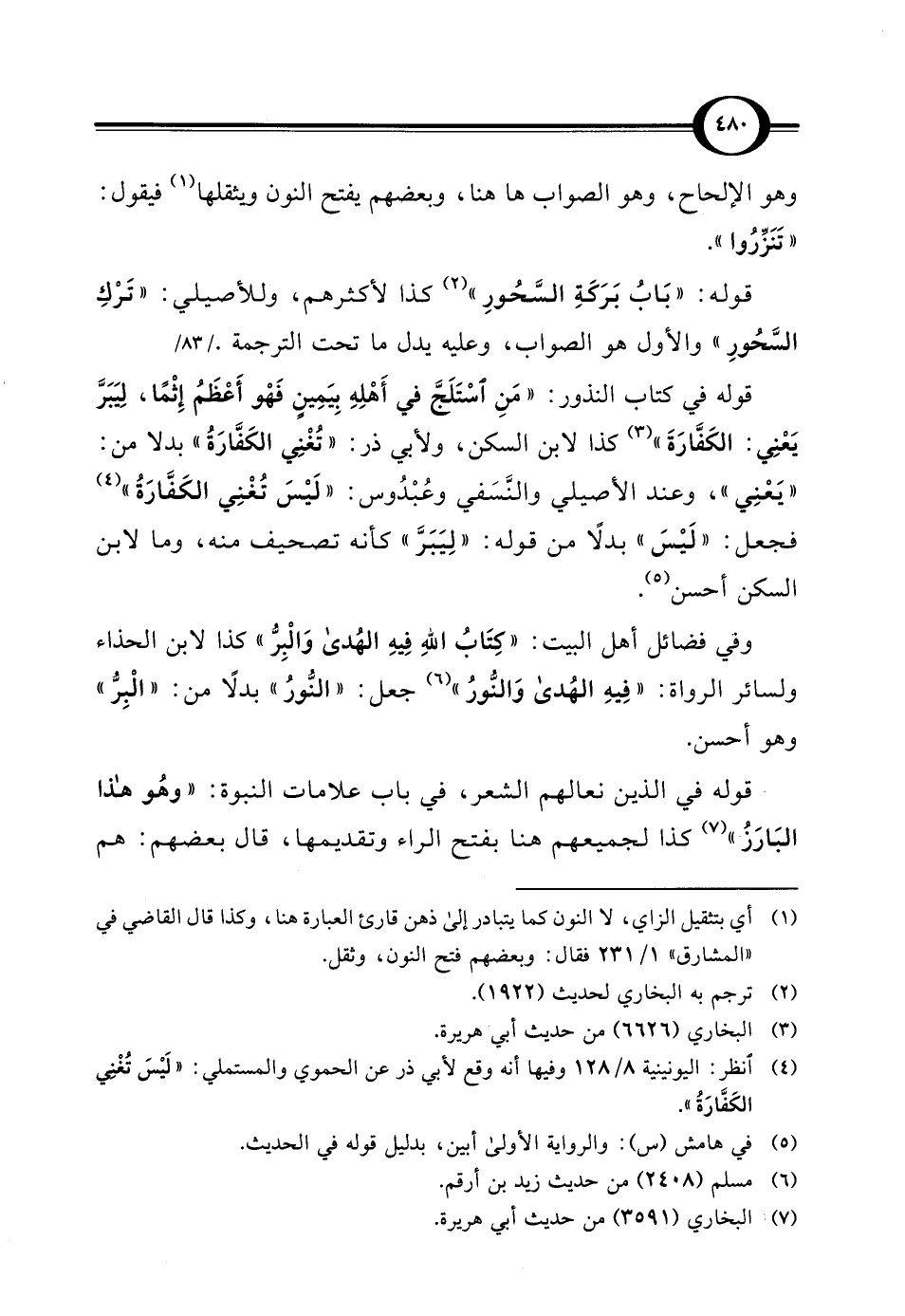 قوله: "بَابُ بَرَكَةِ السَّحُورِ" (¬2) كذا لأكثرهم، وللأصيلي: "تَرْكِ السَّحُورِ" والأول هو الصواب، وعليه يدل ما تحت الترجمة. قوله في كتاب النذور: "مَنِ اسْتَلَجَّ في أَهْلِهِ بِيَمِينٍ فَهْو أَعْظَمُ إِثْمًا، لِيَبَرَّ يَعْنِي: الكَفَّارَةَ" (¬3) كذا لابن السكن، ولأبي ذر: "تُغْنِي الكَفَّارَةُ" بدلا من: "يَعْنِي"، وعند الأصيلي والنَّسَفي وعُبْدُوس: "لَيْسَ تُغْنِي الكَفَّارَةُ" (¬4) فجعل: "لَيْسَ" بدلًا من قوله: "لِيَبَرَّ" كأنه تصحيف منه، وما لابن السكن أحسن (¬5).