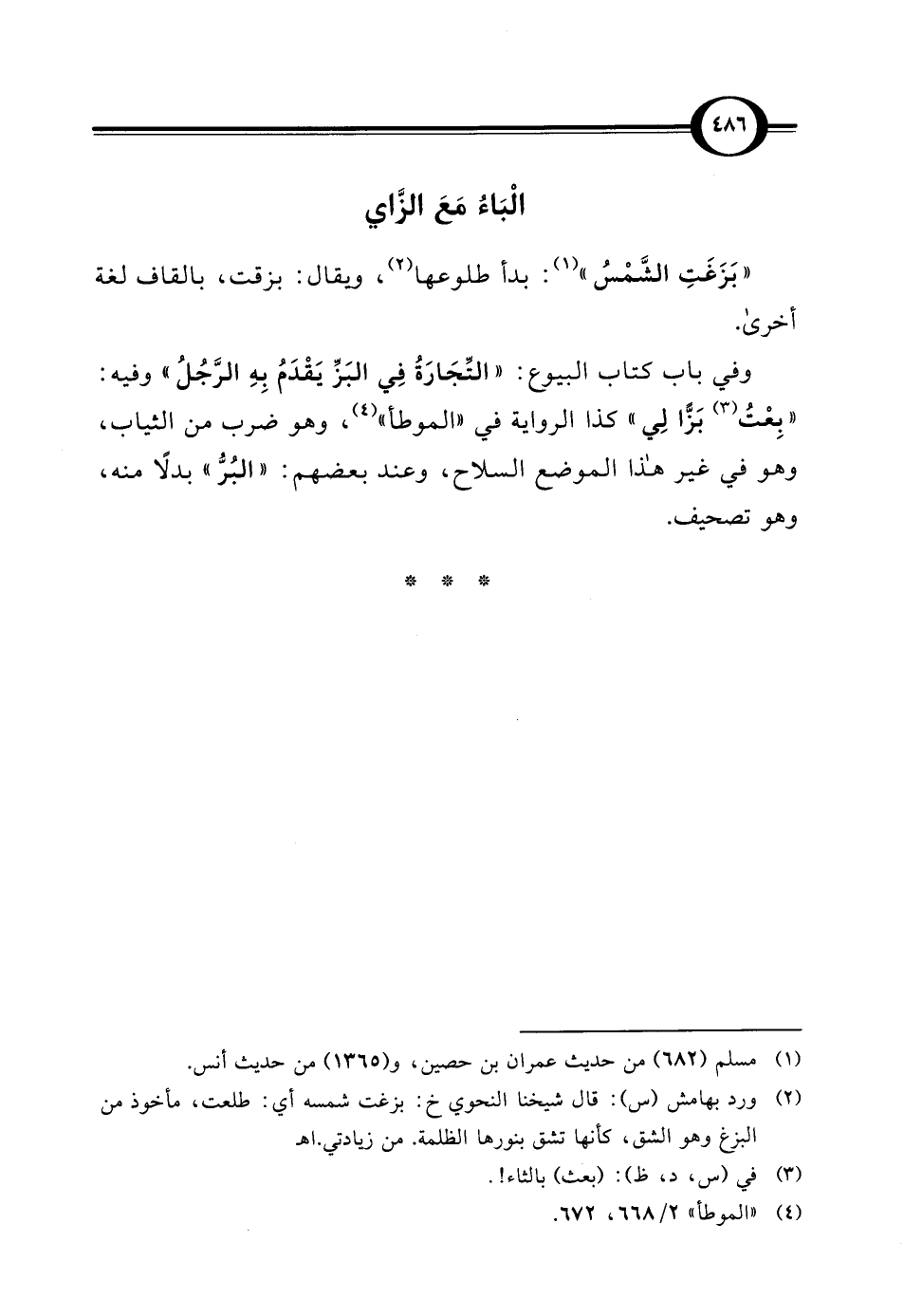 " بَزَغَتِ الشَّمْسُ" (¬1): بدأ طلوعها (¬2)، ويقال: بزقت، بالقاف لغة أخرى.