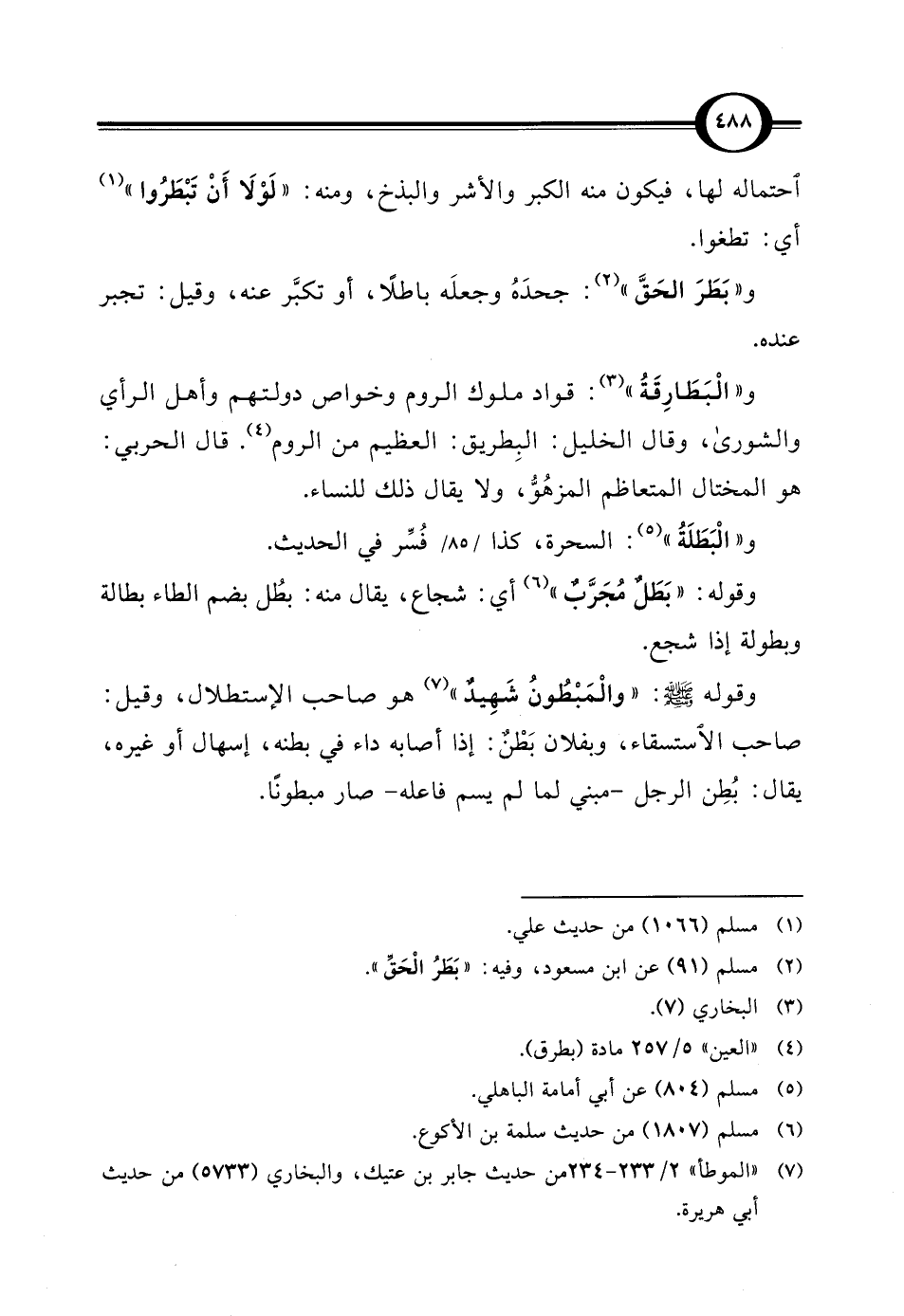 وقوله - صلى الله عليه وسلم -: "والْمَبْطُونُ شَهِيدٌ" (¬7) هو صاحب الإستطلال، وقيل: صاحب الاستسقاء، وبفلان بَطْنٌ: إذا أصابه داء في بطنه، إسهال أو غيره، يقال: بُطِن الرجل - مبني لما لم يسم فاعله - صار مبطونًا.