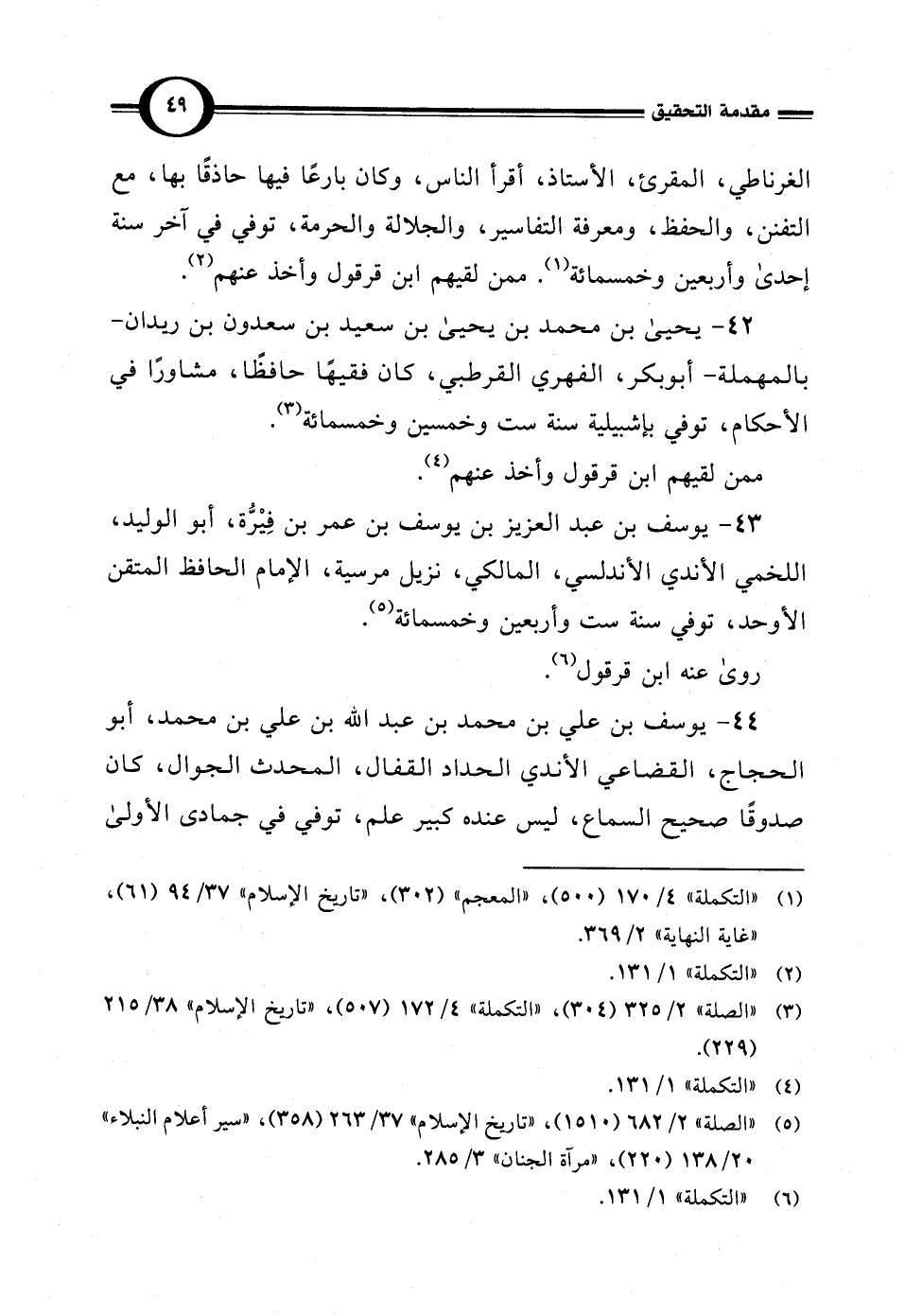 42 - يحيى بن محمد بن يحيى بن سعيد بن سعدون بن زيدان - بالمهملة - أبو بكر، الفهري القرطبي، كان فقيهًا حافظًا، مشاورًا في الأحكام، توفي بإشبيلية سنة ست وخمسين وخمسمائة (¬3).