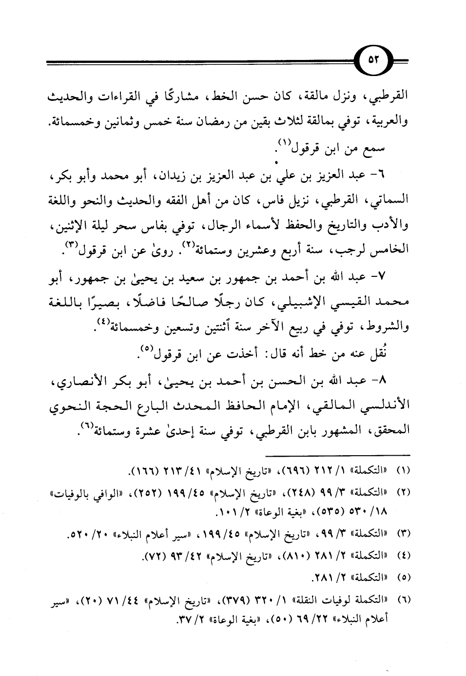 (¬6) "التكملة لوفيات النقلة" 1/ 320 (379)، "تاريخ الإِسلام" 44/ 71 (20)، "سير أعلام النبلاء" 22/ 69 (50)، "بغية الوعاة" 2/ 37.