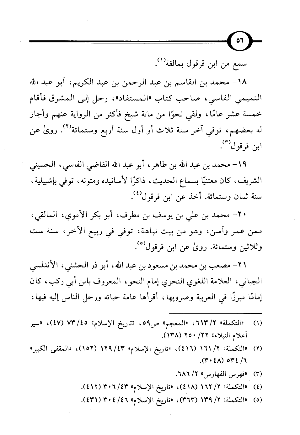 19 - محمَّد بن عبد الله بن طاهر، أبو عبد الله القاضي الفاسي، الحسيني الشريف، كان معتنيًا بسماع الحديث، ذاكرًا لأسانيده ومتونه، توفي بإشبيلية، سنة ثمان وستمائة. أخذ عن ابن قرقول (¬4).