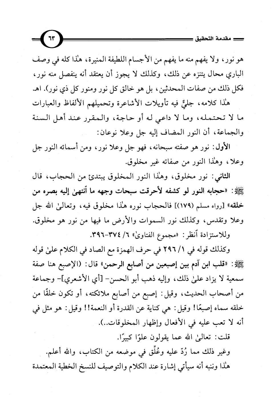 هذا كلامه، جليٌّ فيه تأويلات الأشاعرة وتحميلهم الألفاظ والعبارات ما لا تحتمله، وما لا داعي له أو حاجة، والمقرر عند أهل السنة والجماعة، أن النور المضاف إليه جل وعلا نوعان: الأول: نور هو صفته سبحانه، فهو جل وعلا نور، ومن أسمائه النور جل وعلا، وهذا النور من صفاته غير مخلوق.