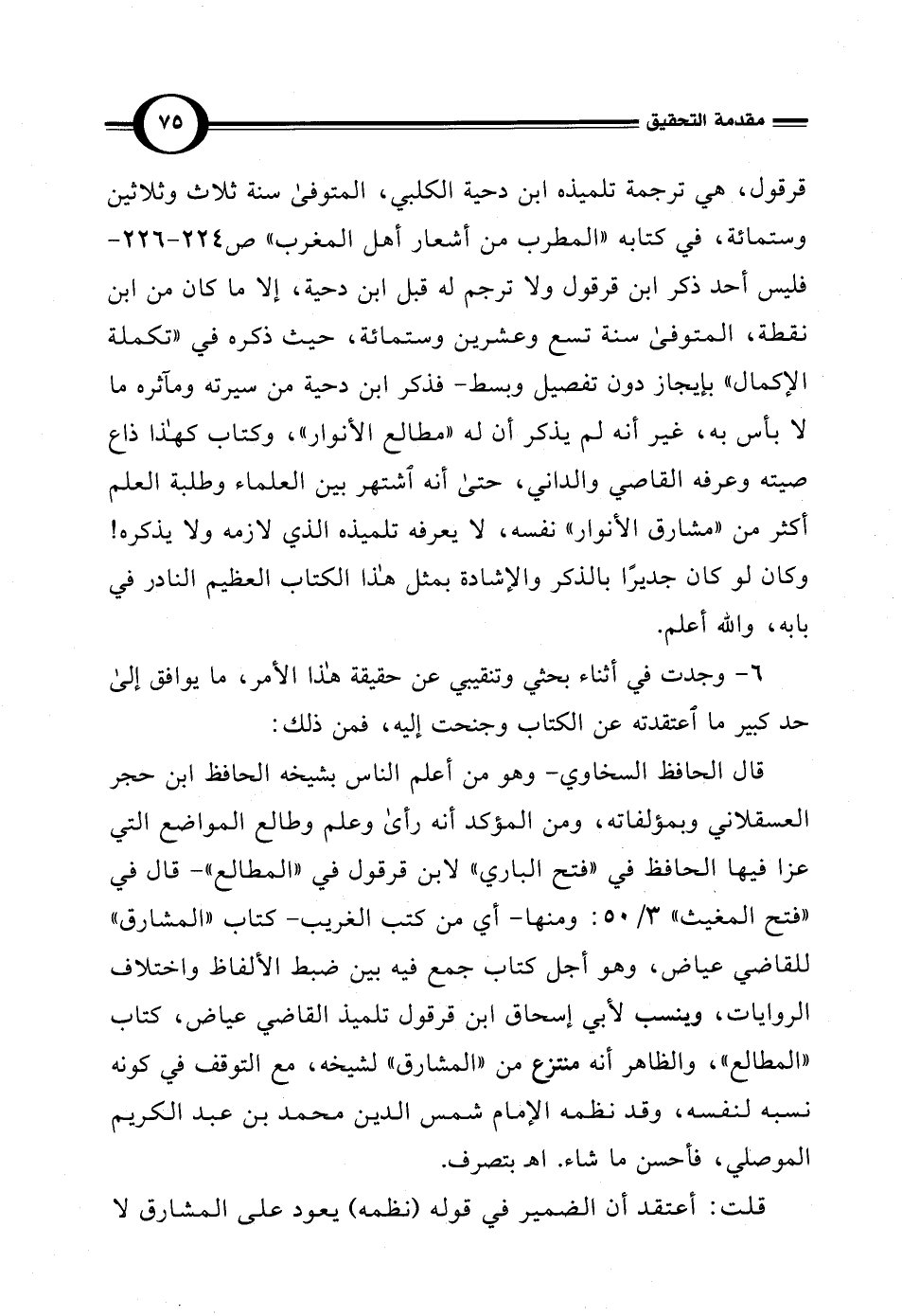 6 - وجدت في أثناء بحثي وتنقيبي عن حقيقة هذا الأمر، ما يوافق إلى حد كبير ما اعتقدته عن الكتاب وجنحت إليه، فمن ذلك: قال الحافظ السخاوي - وهو من أعلم الناس بشيخه الحافظ ابن حجر العسقلاني وبمؤلفاته، ومن المؤكد أنه رأى وعلم وطالع المواضع التي عزا فيها الحافظ في "فتح الباري" لابن قرقول في "المطالع" - قال في "فتح المغيث" 3/ 50: ومنها -أي من كتب الغريب - كتاب "المشارق" للقاضي عياض، وهو أجل كتاب جمع فيه بين ضبط الألفاظ واختلاف الروايات، وينسب لأبي إسحاق ابن قرقول تلميذ القاضي عياض، كتاب "المطالع"، والظاهر أنه منتزع من "المشارق" لشيخه، مع التوقف في كونه نسبه لنفسه، وقد نظمه الإِمام شمس الدين محمَّد بن عبد الكريم الموصلي، فأحسن ما شاء. اهـ بتصرف.