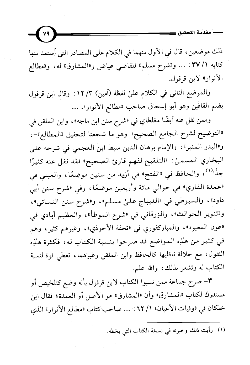 والموضع الثاني في الكلام على لفظة (آمين) 3/ 12: وقال ابن قرقول بضم القافين وهو أبو إسحاق صاحب "مطالع الأنوار" .... وممن نقل عنه أيضًا مغلطاي في "شرح سنن ابن ماجه"، وابن الملقن في "التوضيح لشرح الجامع الصحيح" - وهو ما شجعنا لتحقيق "المطالع" -، و"البدر المنير"، والإمام برهان الدين سبط ابن العجمي في شرحه على البخاري المسمى: "التلقيح لفهم قارئ الصحيح" فقد نقل عنه كثيراً جدًّا (¬1)، والحافظ في "الفتح" في أزيد من ستين موضعًا، والعيني في "عمدة القاري" في حوالي مائة وأربعين موضعًا، وفي "شرح سنن أبي داود"، والسيوطي في "الديباج على مسلم"، و"شرح سنن النسائي"، و"تنوير الحوالك"، والزرقاني في "شرح الموطأ"، والعظيم أبادي في "عون المعبود"، والمباركفوري في "تحفة الأحوذي"، وغيرهم كثير، وهم في كثير من هذِه المواضع قد صرح وابن سبة الكتاب له، فكثرة هذِه النقول، مع جلالة ناقليها كالحافظ وابن الملقن وغيرهما، تعطي قوة لنسبة الكتاب له وتشعر بذلك، والله علم.