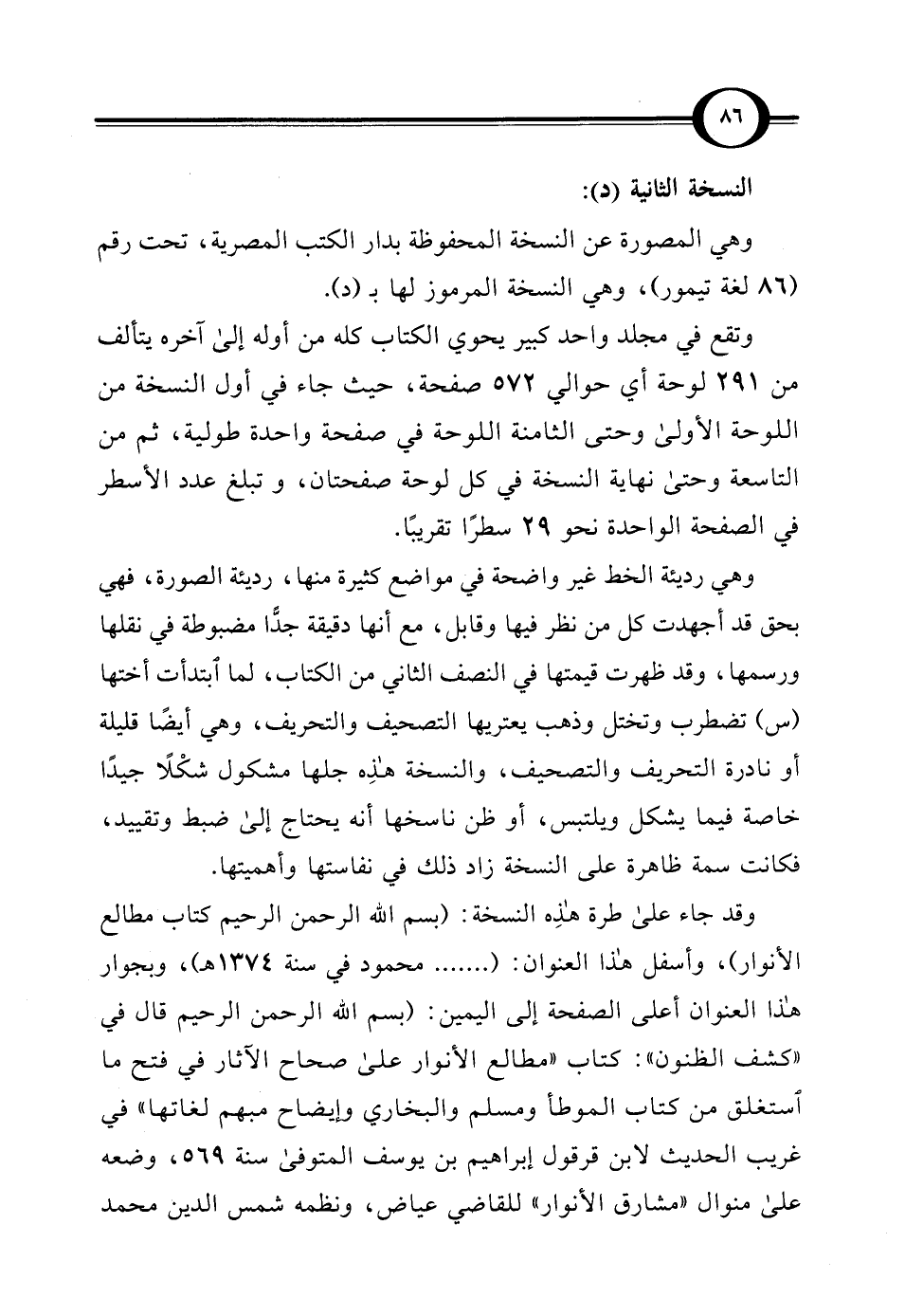 النسخة الثانية (د): وهي المصورة عن النسخة المحفوظة بدار الكتب المصرية، تحت رقم (86 لغة تيمور)، وهي النسخة المرموز لها بـ (د).