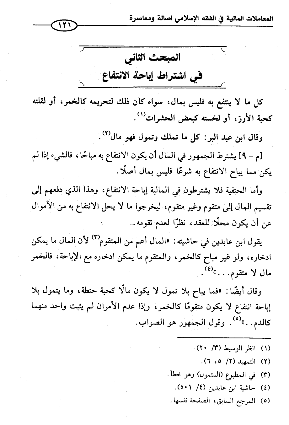 وقال أيضًا: "فما يباح بلا تمول لا يكون مالاً كحبة حنطة، وما يتمول بلا إباحة انتفاع لا يكون متقومًا كالخمر، وإذا عدم الأمران لم يثبت واحد منهما كالدم .. " (¬٥). وقول الجمهور هو الصواب.