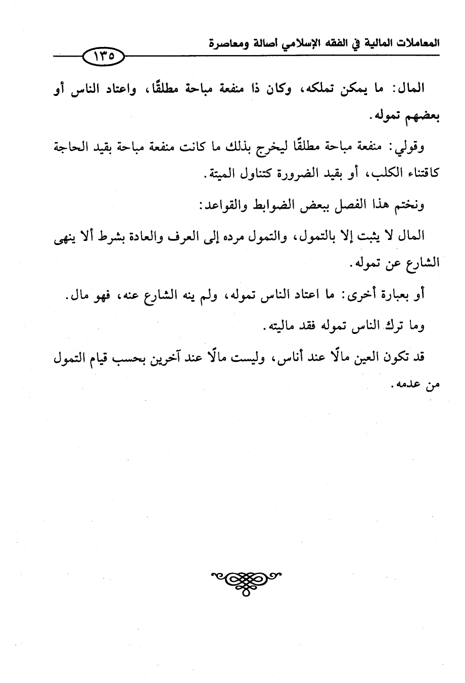 أو بعبارة أخرى: ما اعتاد الناس تموله، ولم ينه الشارع عنه، فهو مال. وما ترك الناس تموله فقد ماليته.