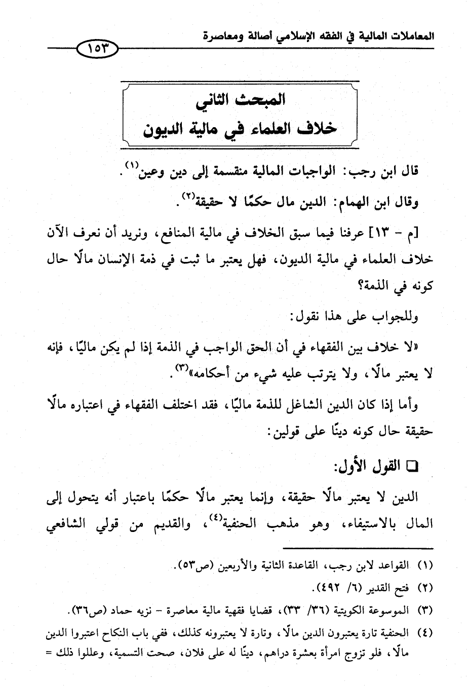 الدين لا يعتبر مالًا حقيقة، وإنما يعتبر مالًا حكمًا باعتبار أنه يتحول إلى المال بالاستيفاء، وهو مذهب الحنفية (¬٤)، والقديم من قولي الشافعي