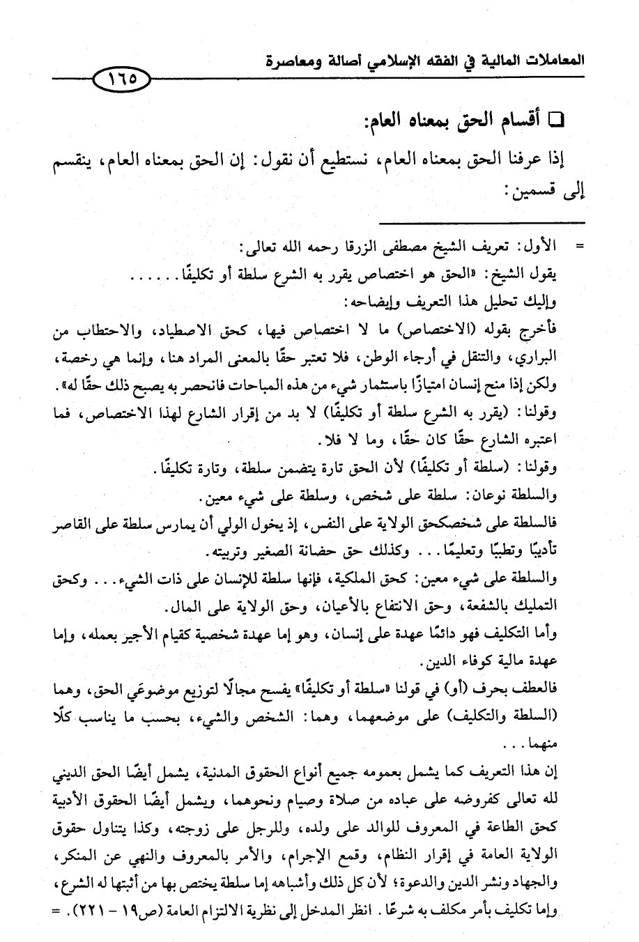 إن هذا التعريف كما يشمل بعمومه جميع أنواع الحقوق المدنية، يشمل أيضًا الحق الديني لله تعالى كفروضه على عباده من صلاة وصيام ونحوهما، ويشمل أيضًا الحقوق الأدبية كحق الطاعة في المعروف للوالد على ولده، وللرجل على زوجته، وكذا يتناول حقوق الولاية العامة في إقرار النظام، وقمع الإجرام، والأمر بالمعروف والنهي عن المنكر، والجهاد ونشر الدين والدعوة؛ لأن كل ذلك وأشباهه إما سلطة يختص بها من أثبتها له الشرع، وإما تكليف بأمر مكلف به شرعا. انظر المدخل إلى نظرية الالتزام العامة (ص ١٩ - ٢٢١). =