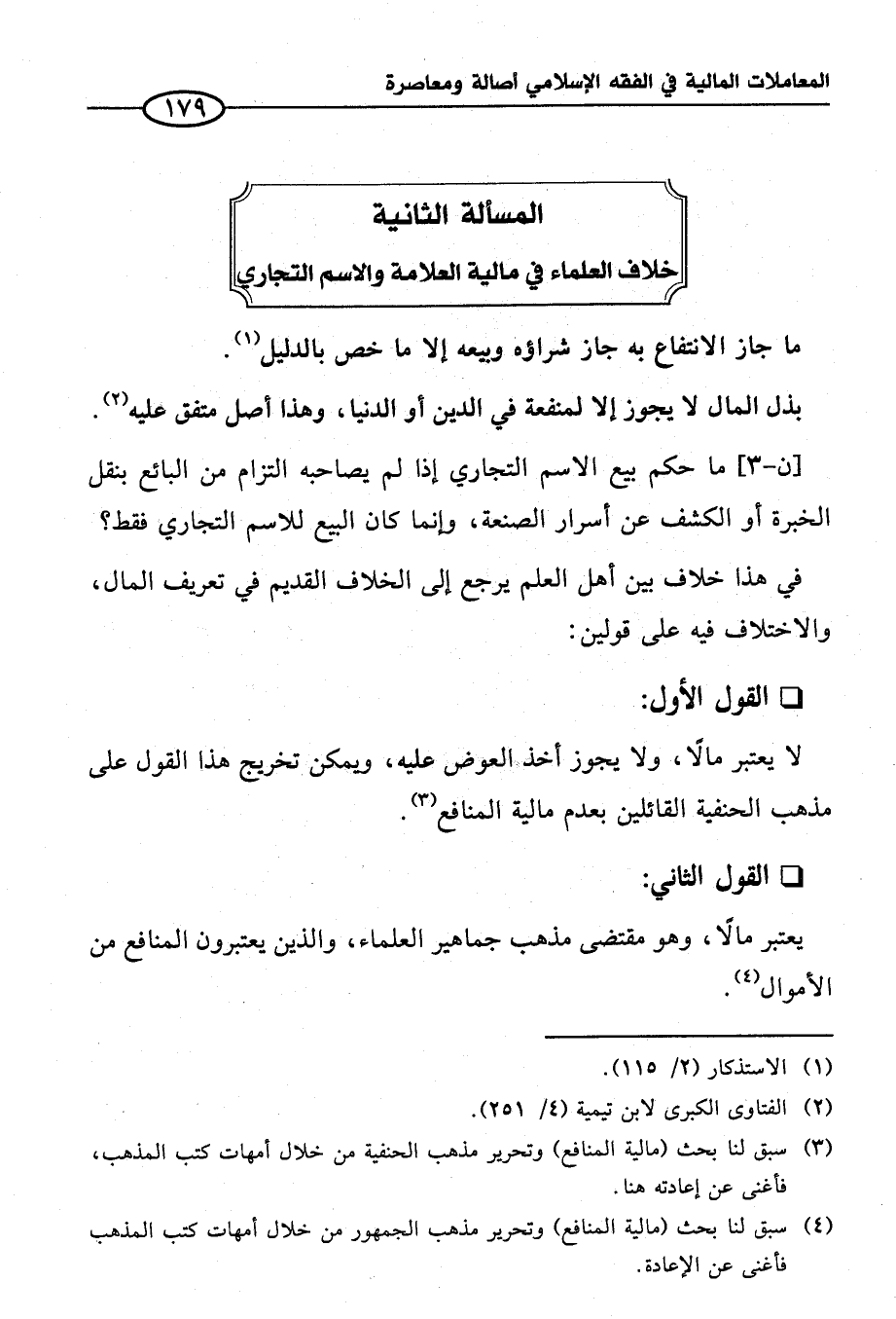 (¬٤) سبق لنا بحث (مالية المنافع) وتحرير مذهب الجمهور من خلال أمهات كتب المذهب فأغنى عن الإعادة.