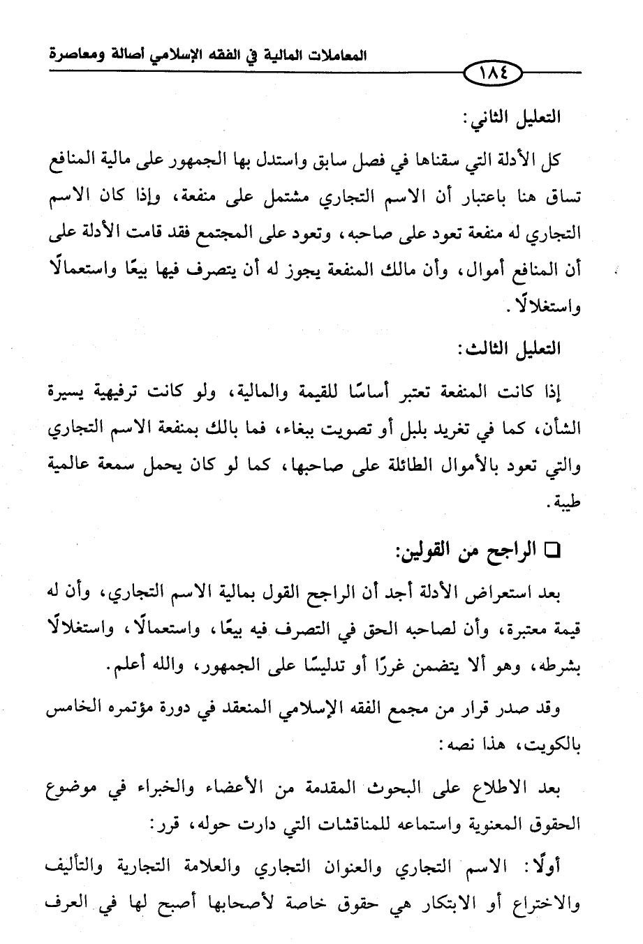 بعد استعراض الأدلة أجد أن الراجح القول بمالية الاسم التجاري، وأن له قيمة معتبرة، وأن لصاحبه الحق في التصرف فيه بيعًا، واستعمالًا، واستغلالًا بشرطه، وهو ألا يتضمن غررًا أو تدليسًا على الجمهور، والله أعلم.