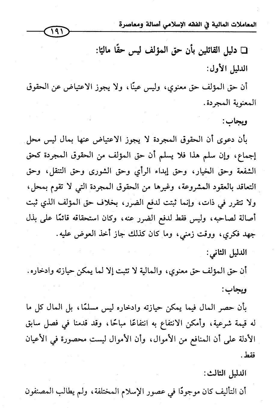 بأن دعوى أن الحقوق المجردة لا يجوز الاعتياض عنها بمال ليس محل إجماع، وإن سلم هذا فلا يسلم أن حق المؤلف من الحقوق المجردة كحق الشفعة وحق الخيار، وحق إبداء الرأي وحق الشورى وحق التنقل، وحق التعاقد بالعقود المشروعة، وغيرها من الحقوق المجردة التي لا تقوم بمحل، ولا تتقرر في ذات، وإنما ثبتت لدفع الضرر، بخلاف حق المؤلف الذي ثبت أصالة لصاحبه، وليس فقط لدفع الضرر عنه، وكان استحقاقه قائمًا على بذل جهد فكري، ووقت زمني، وما كان كذلك جاز أخذ العوض عليه.