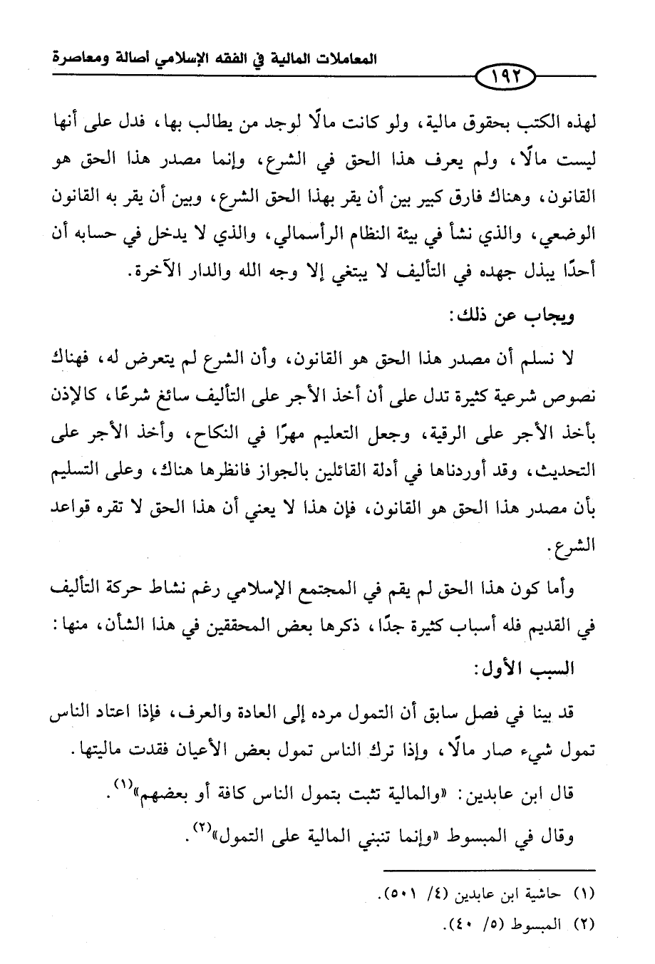 لا نسلم أن مصدر هذا الحق هو القانون، وأن الشرع لم يتعرض له، فهناك نصوص شرعية كثيرة تدل على أن أخذ الأجر على التأليف سائغ شرعًا، كالإذن بأخذ الأجر على الرقية، وجعل التعليم مهرًا في النكاح، وأخذ الأجر على التحديث، وقد أوردناها في أدلة القائلين بالجواز فانظرها هناك، وعلى التسليم بأن مصدر هذا الحق هو القانون، فإن هذا لا يعني أن هذا الحق لا تقره قواعد الشرع.