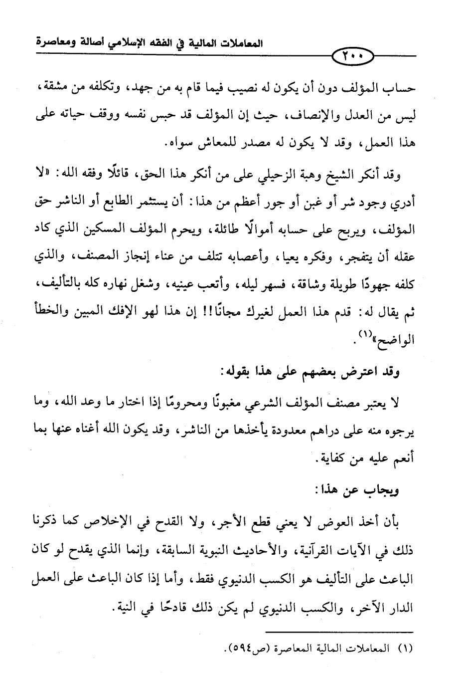 وقد أنكر الشيخ وهبة الزحيلي على من أنكر هذا الحق، قائلًا وفقه الله: "لا أدري وجود شر أو غبن أو جور أعظم من هذا: أن يستثمر الطابع أو الناشر حق المؤلف، ويربح على حسابه أموالًا طائلة، ويحرم المؤلف المسكين الذي كاد عقله أن يتفجر، وفكره يعيا، وأعصابه تتلف من عناء إنجاز المصنف، والذي كلفه جهودًا طويلة وشاقة، فسهر ليله، وأتعب عينيه، وشغل نهاره كله بالتأليف، ثم يقال له: قدم هذا العمل لغيرك مجانًا!! إن هذا لهو الإفك المبين والخطأ الواضح" (¬١).