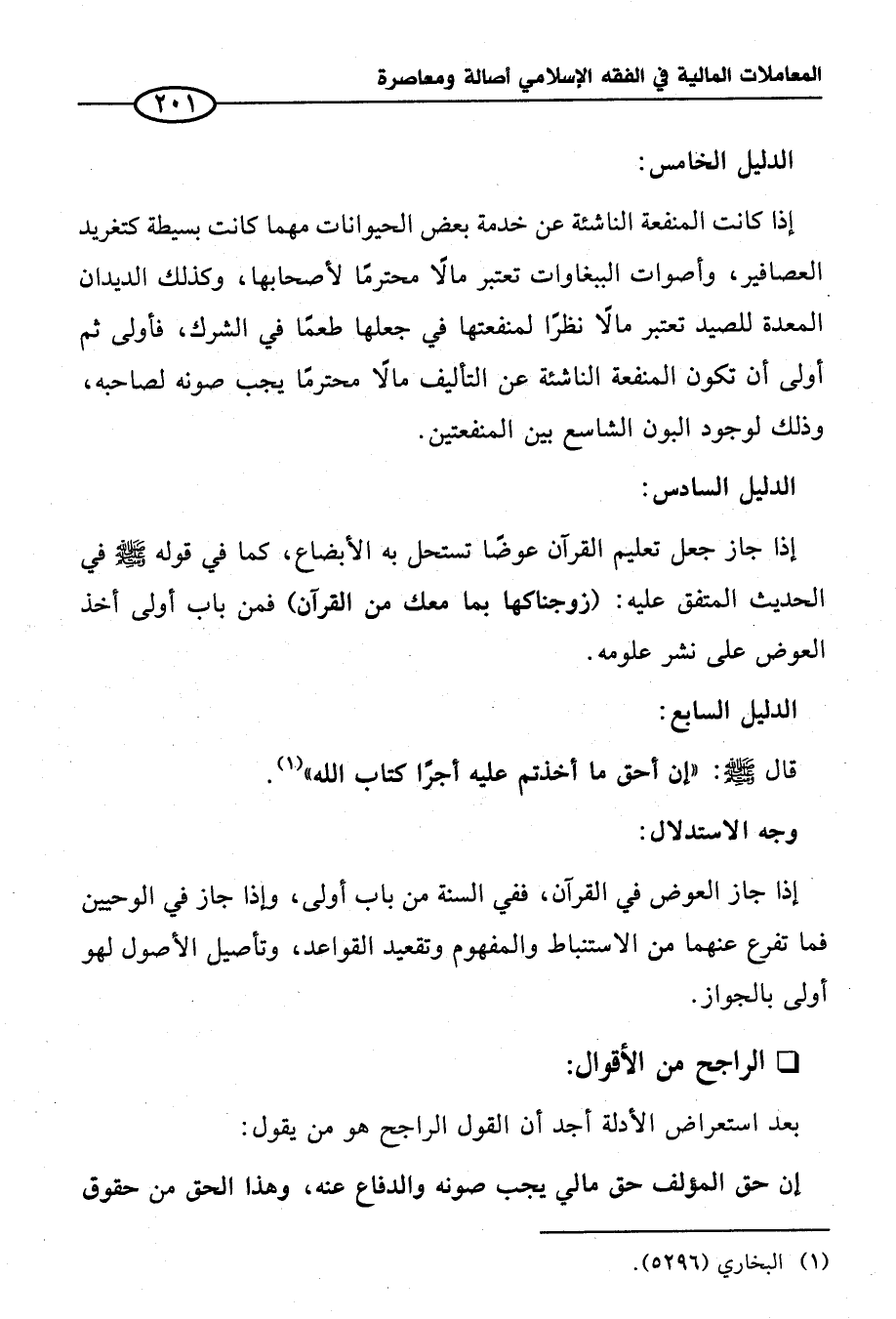 إذا كانت المنفعة الناشئة عن خدمة بعض الحيوانات مهما كانت بسيطة كتغريد العصافير، وأصوات الببغاوات تعتبر مالاً محترمًا لأصحابها، وكذلك الديدان المعدة للصيد تعتبر مالًا نظراً لمنفعتها في جعلها طعمًا في الشرك، فأولى ثم أولى أن تكون المنفعة الناشئة عن التأليف مالاً محترمًا يجب صونه لصاحبه، وذلك لوجود البون الشاسع بين المنفعتين.