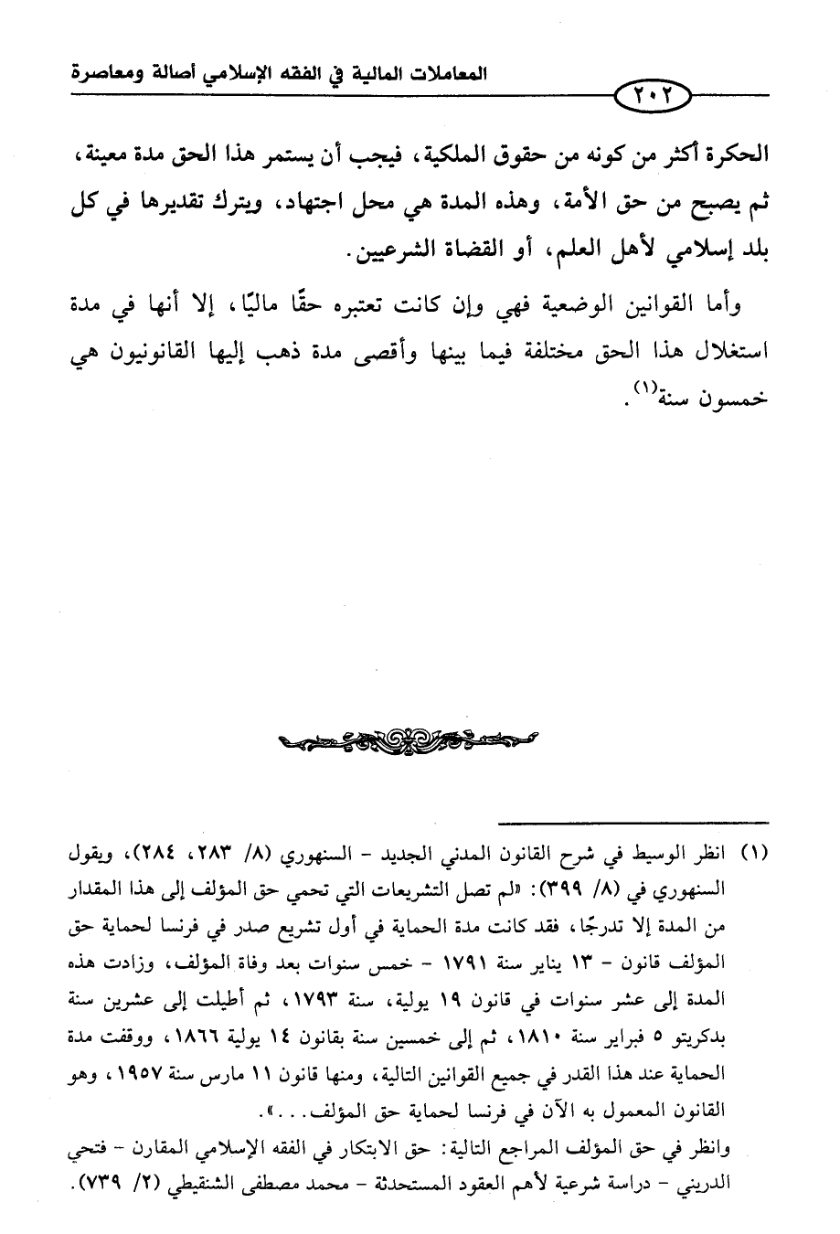 (¬١) انظر الوسيط في شرح القانون المدني الجديد - السنهوري (٨/ ٢٨٣، ٢٨٤)، ويقول السنهوري في (٨/ ٣٩٩): "لم تصل التشريعات التي تحمي حق المؤلف إلى هذا المقدار من المدة إلا تدرجًا، فقد كانت مدة الحماية في أول تشريع صدر في فرنسا لحماية حق المؤلف قانون - ١٣ يناير سنة ١٧٩١ - خمس سنوات بعد وفاة المؤلف، وزادت هذه المدة إلى عشر سنوات في قانون ١٩ يولية، سنة ١٧٩٣، ثم أطيلت إلى عشرين سنة بدكريتو ٥ فبراير سنة ١٨١٠، ثم إلى خمسين سنة بقانون ١٤ يولية ١٨٦٦، ووقفت مدة الحماية عند هذا القدر في جميع القوانين التالية، ومنها قانون ١١ مارس سنة ١٩٥٧، وهو القانون المعمول به الآن في فرنسا لحماية حق المؤلف ... ".