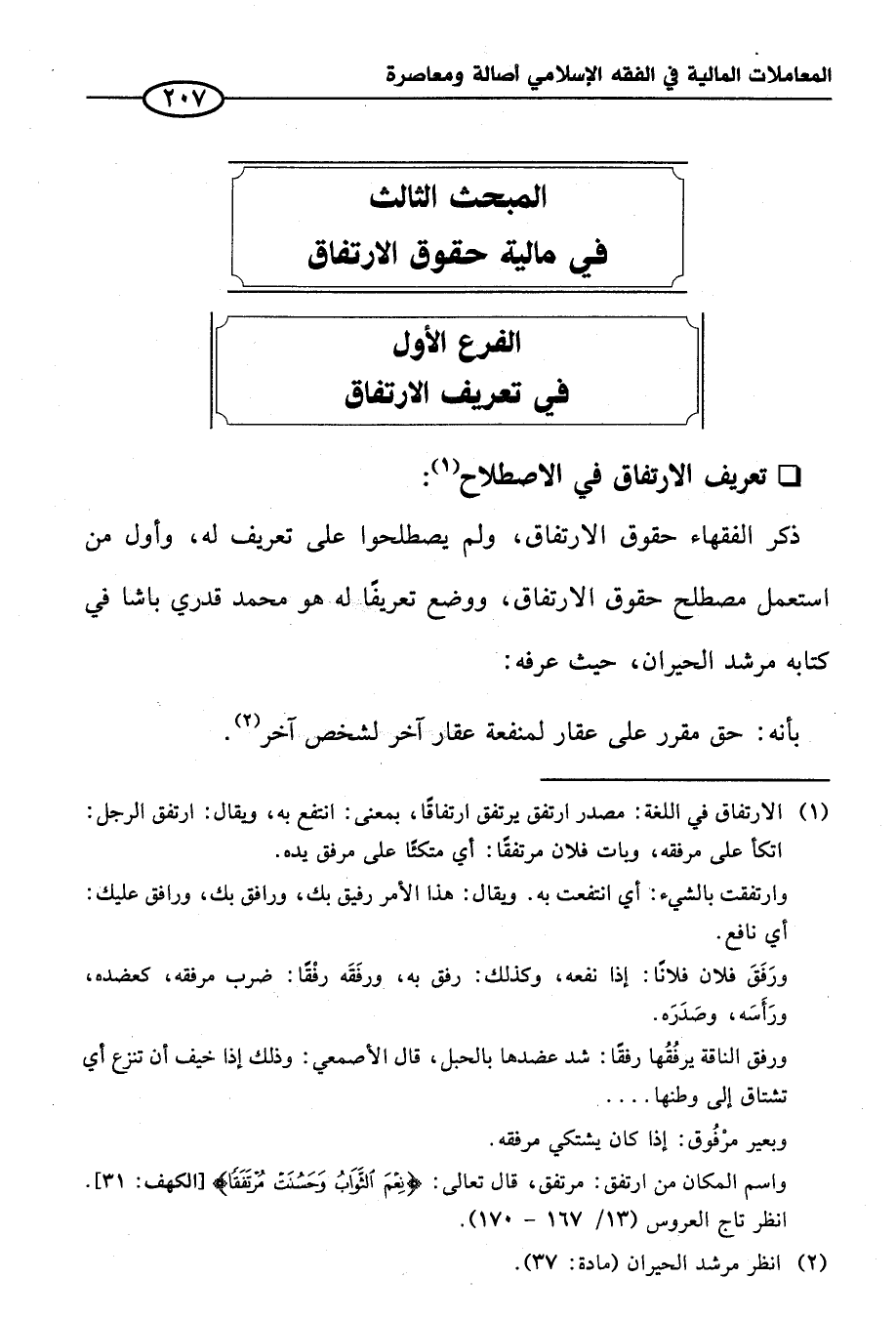 (¬١) الارتفاق في اللغة: مصدر ارتفق يرتفق ارتفاقًا, بمعني: انتفع به, ويقال: ارتفق الرجل: اتكأ على مرفقه، وبات فلان مرتفقا: أي متكئا على مرفق يده.