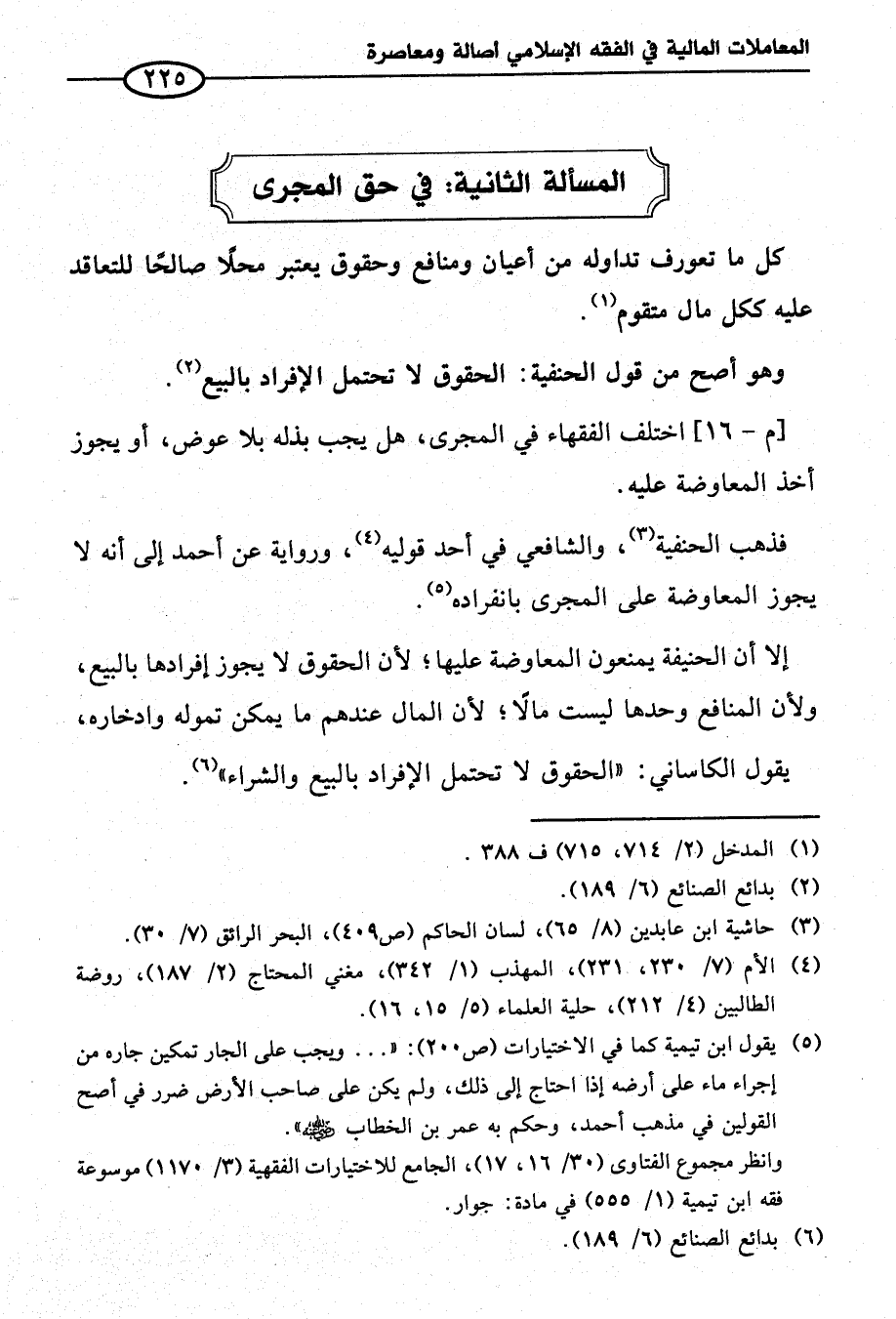 (¬٥) يقول ابن تيمية كما في الاختيارات (ص ٢٠٠): " ... ويجب على الجار تمكين جاره من إجراء ماء على أرضه إذا احتاج إلى ذلك، ولم يكن على صاحب الأرض ضرر في أصح القولين في مذهب أحمد، وحكم به عمر بن الخطاب - رضي الله عنه -".