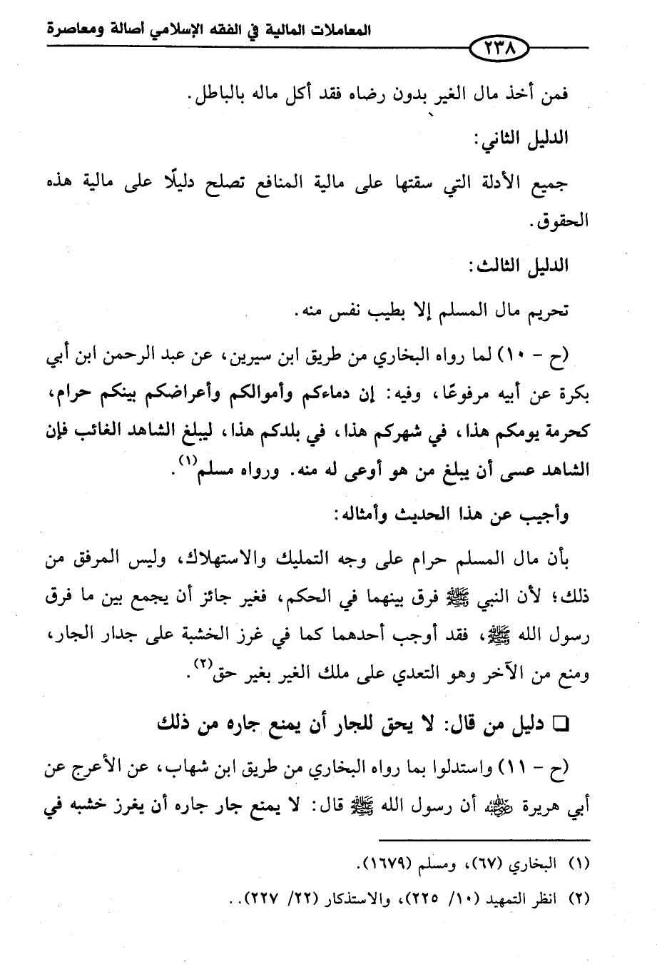 (ح- ١٠) لما رواه البخاري من طريق ابن سيرين، عن عبد الرحمن ابن أبي بكرة عن أبيه مرفوعا، وفيه: إن دماءكم وأموالكم وأعراضكم بينكم حرام، كحرمة يومكم هذا، في شهركم هذا، في بلدكم هذا، ليبلغ الشاهد الغائب فإن الشاهد عسى أن يبلغ من هو أوعى له منه. ورواه مسلم (¬١).