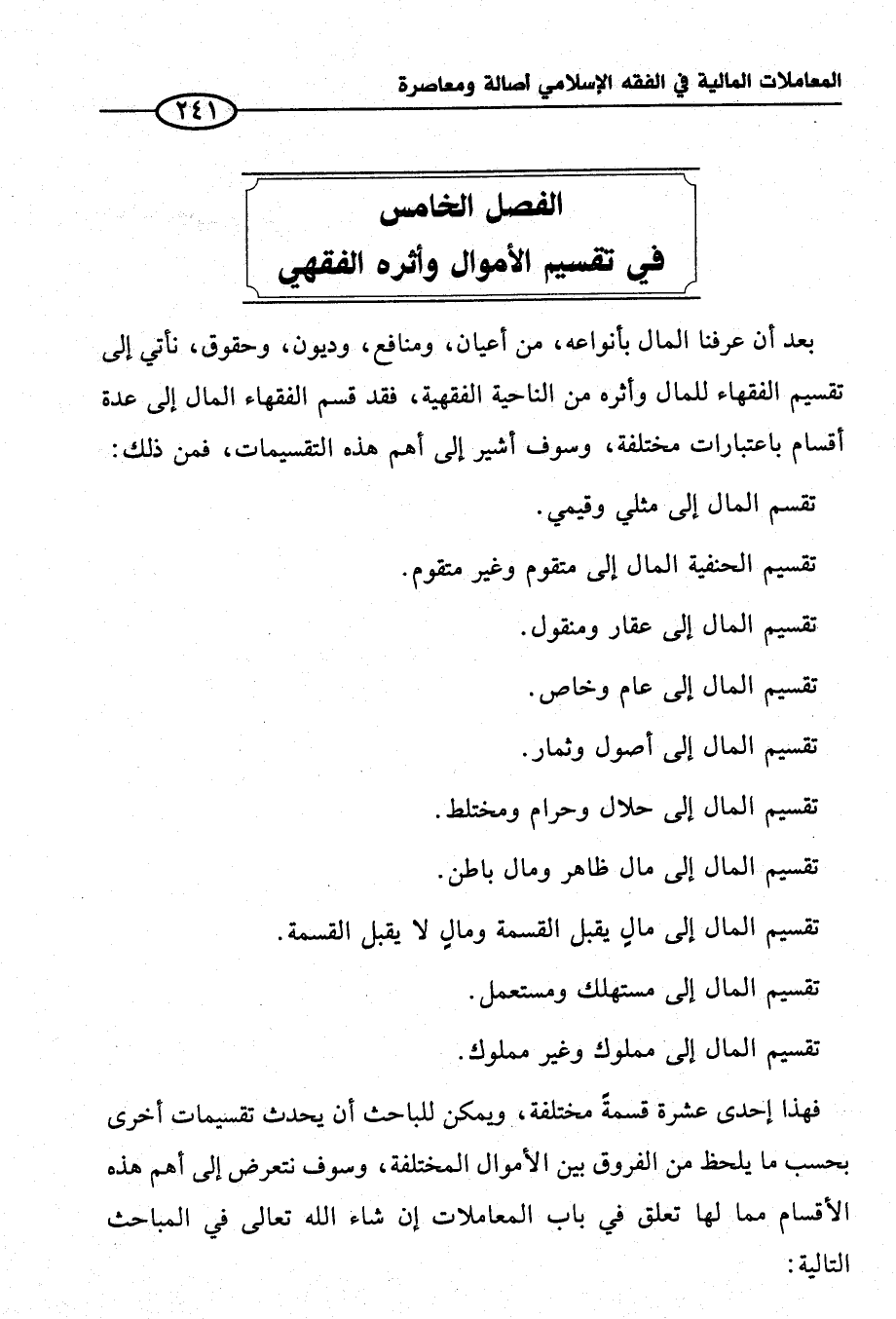 الفصل الخامس في تقسيم الأموال وأثره الفقهي