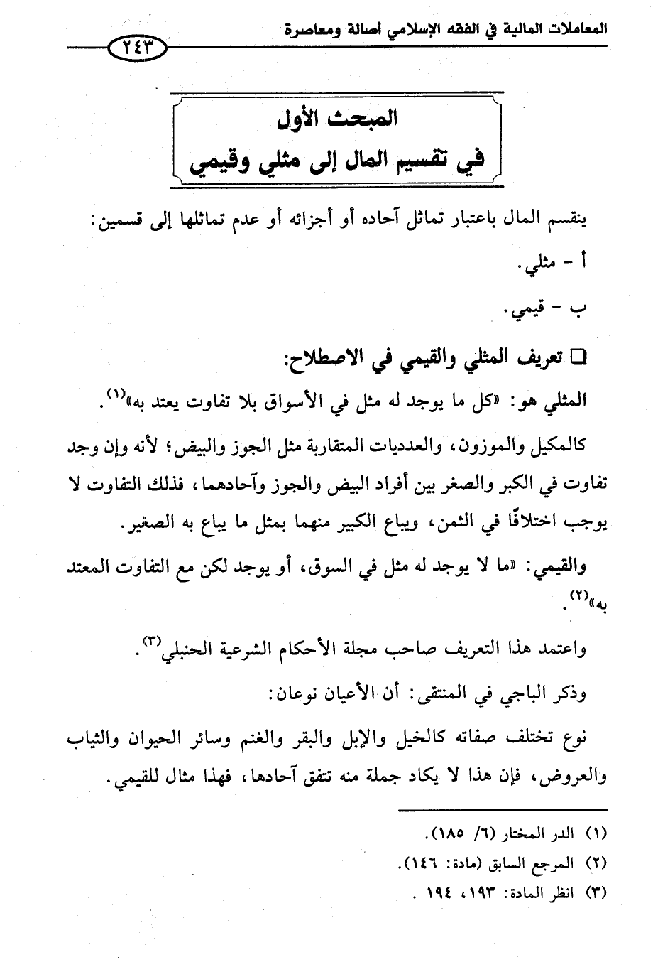 المبحث الأول في تقسيم المال إلى مثلي وقيمي