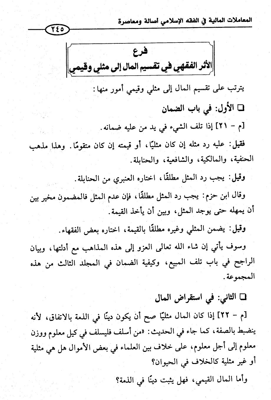 فرع الأثر الفقهي في تقسيم المال إلى مثلي وقيمي