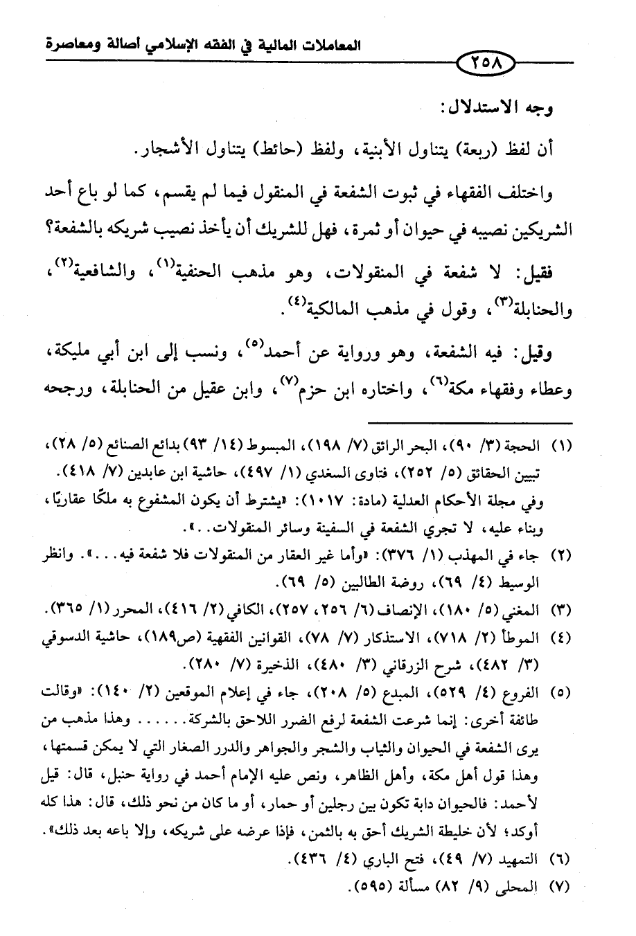 (¬٥) الفروع (٤/ ٥٢٩)، المبدع (٥/ ٢٠٨)، جاء في إعلام الموقعين (٢/ ١٤٠): "وقالت طائفة أخرى: إنما شرعت الشفعة لرفع الضرر اللاحق بالشركة ...... وهذا مذهب من يرى الشفعة في الحيوان والثياب والشجر والجواهر والدرر الصغار التي لا يمكن قسمتها، وهذا قول أهل مكة، وأهل الظاهر، ونص عليه الإِمام أحمد في رواية حنبل، قال: قيل لأحمد: فالحيوان دابة تكون بين رجلين أو حمار، أو ما كان من نحو ذلك، قال: هذا كله أوكد؛ لأن خليطة الشريك أحق به بالثمن، فإذا عرضه على شريكه، وإلا باعه بعد ذلك".