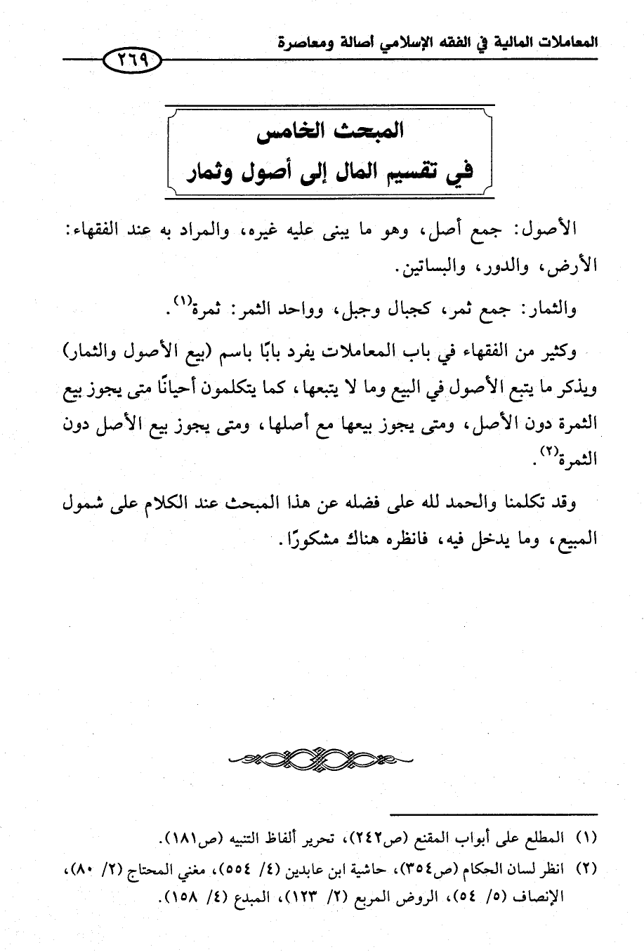 المبحث الخامس في تقسيم المال إلى أصول وثمار