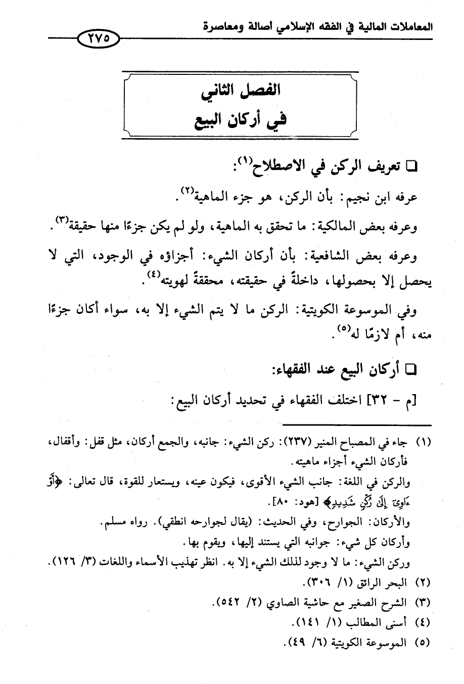 (¬١) جاء في المصباح المنير (٢٣٧): ركن الشيء: جانبه، والجمع أركان، مثل قفل: وأقفال، فأركان الشيء أجزاء ماهيته.