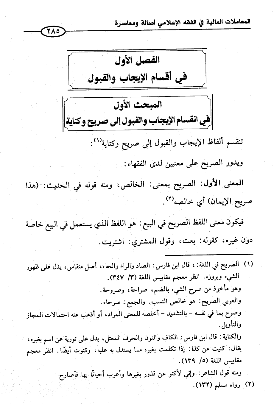 المبحث الأول في انقسام الإيجاب والقبول إلى صريح وكناية