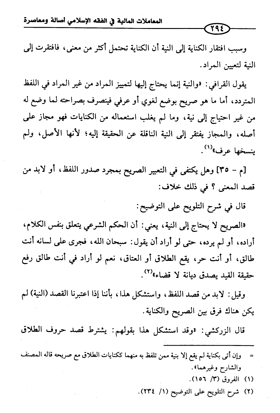 يقول القرافي: "والنية إنما يحتاج إليها لتمييز المراد من غير المراد في اللفظ المتردد، أما ما هو صريح بوضع لغوي أو عرفي فينصرف بصراحته لما وضع له من غير احتياج إلى نية، وما لم يغلب استعماله من الكنايات فهو مجاز على أصله، والمجاز يفتقر إلى النية الناقلة عن الحقيقة إليه؛ لأنها الأصل، ولم ينسخها عرف" (¬١).